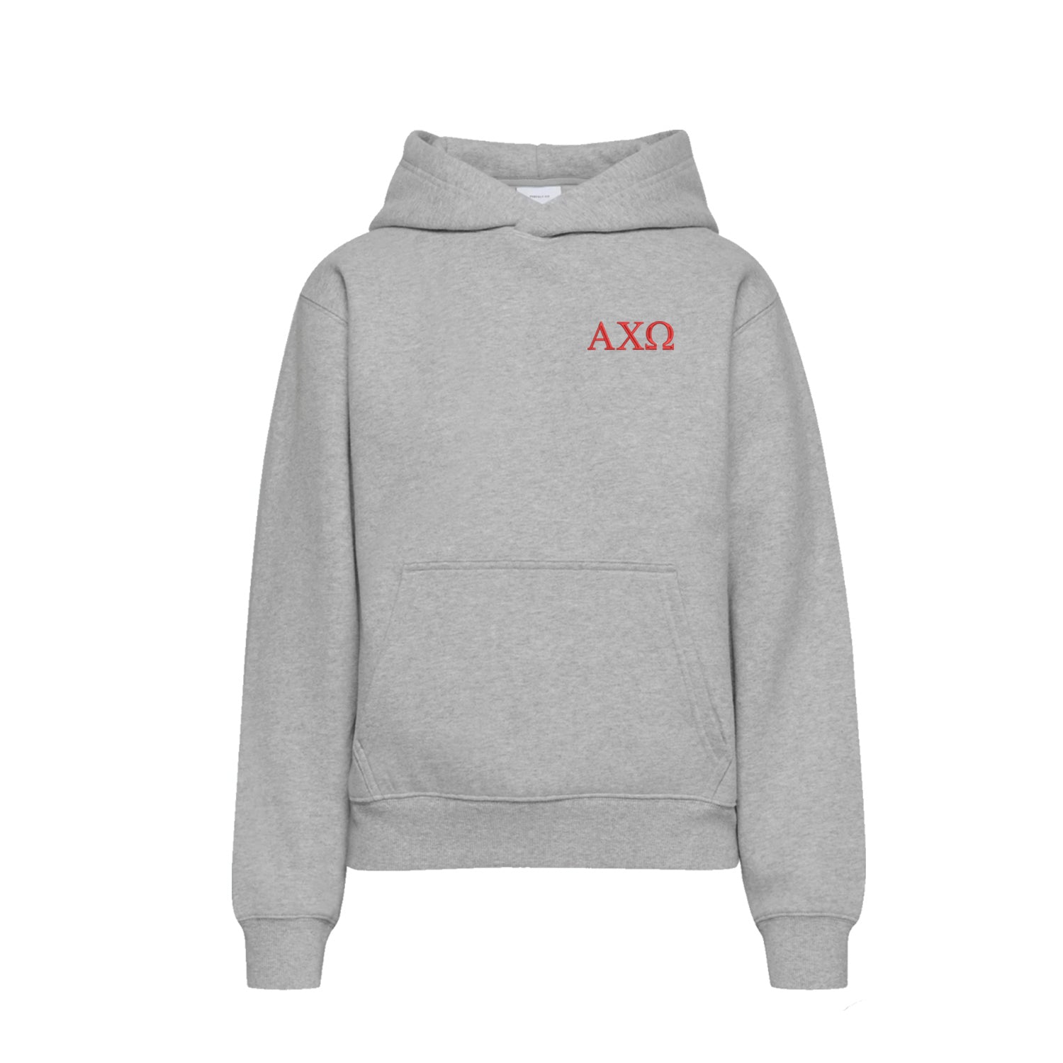 Hooded Pullover and fleece short set both embroidered with Alpha Chi Omega Greek letters.