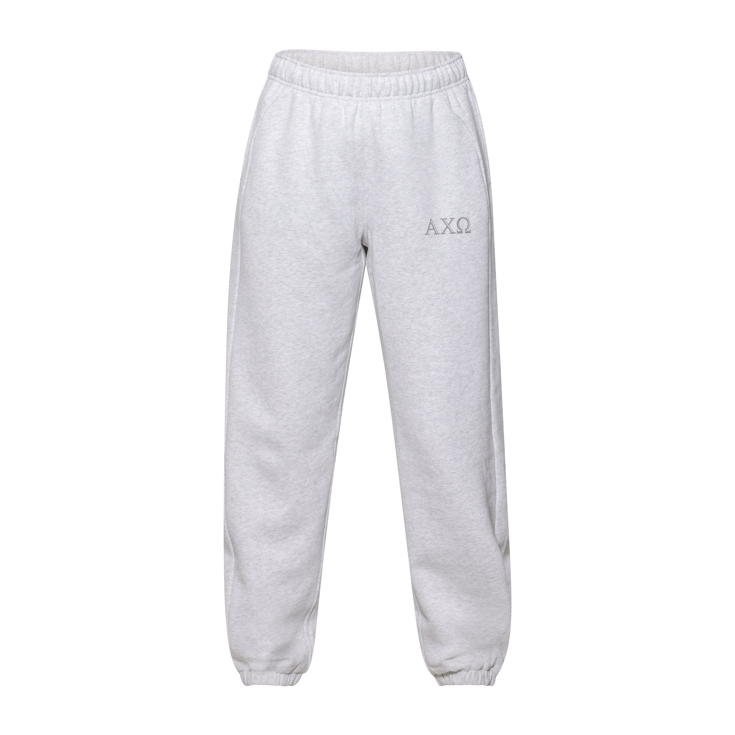 Serious about softness. These Alpha Chi Omega scuba sweatpants are all about fleecy fabric and sinking in to a slouchy oversized fit. Available in Heathered Core Ultra Light Grey and embroidered with Alpha Chi Omega Greek letters in choice of monochromatic grey or AChiO red or green.