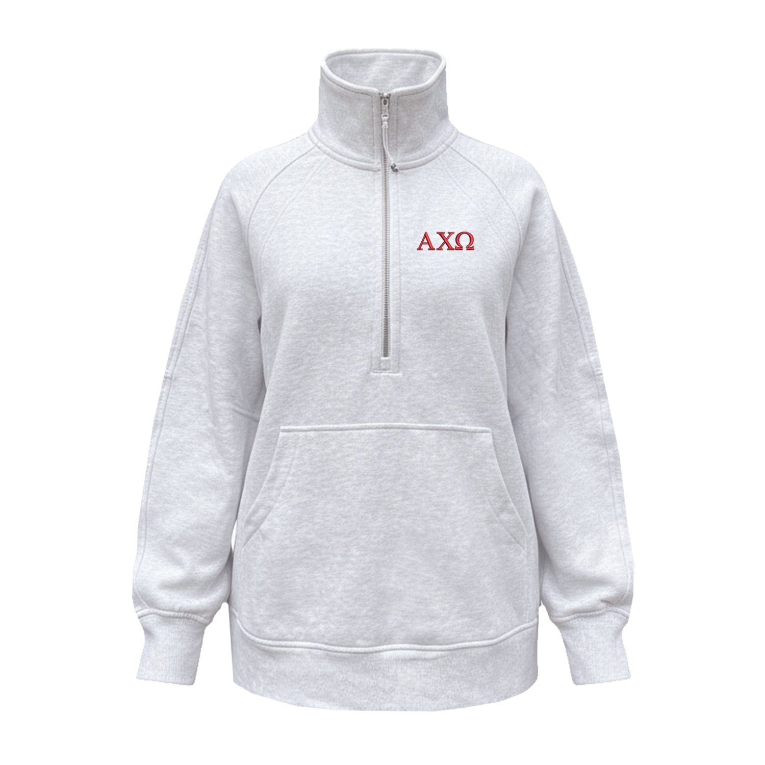 Serious about softness. This funnel-neck half zip is all about fleecy fabric and sinking in to a cozy oversized fit. Available in Heathered Core Ultra Light Grey with your Alpha Chi Omega letters embroidered in red thread.