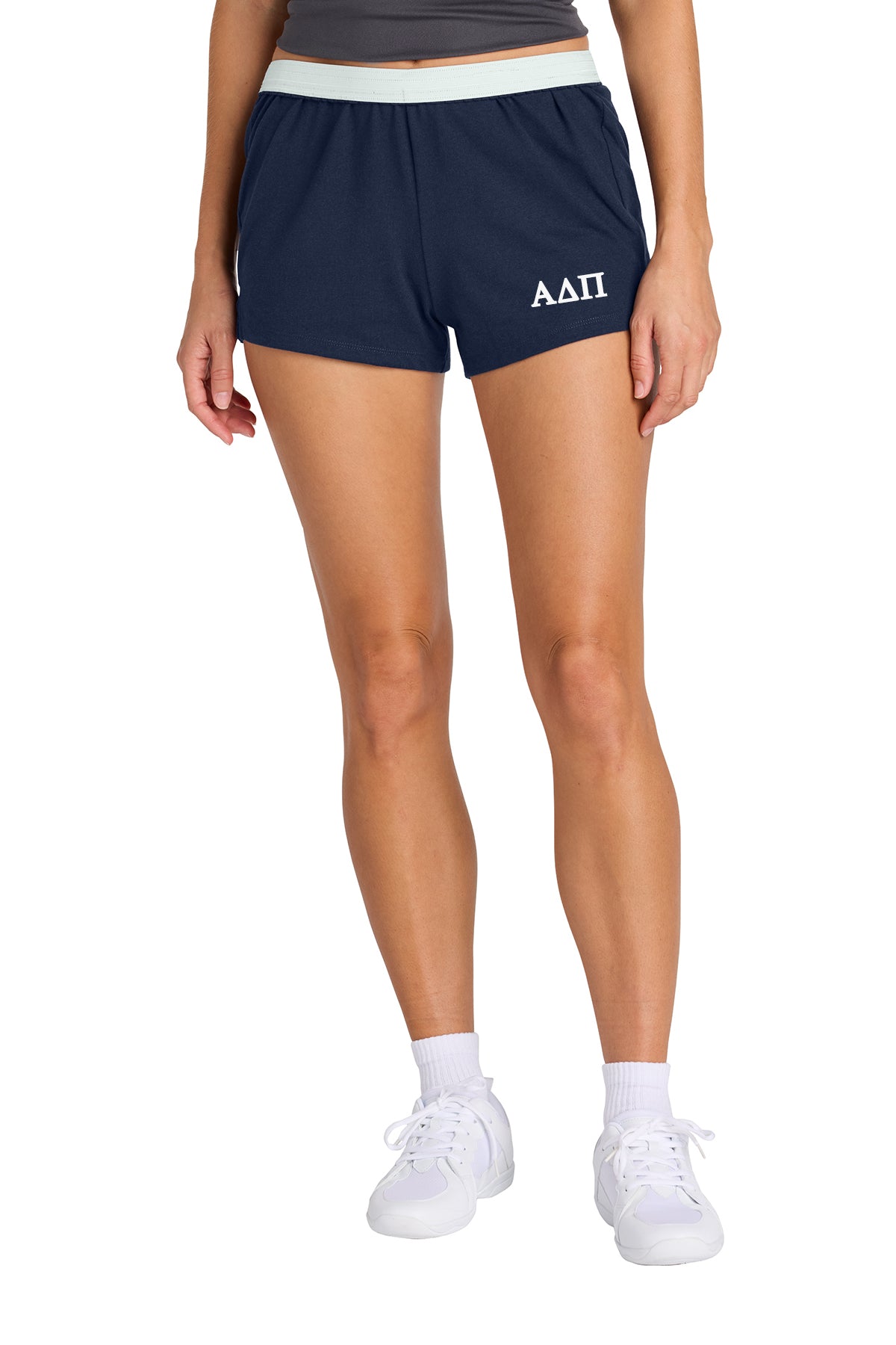 Old school gym shorts come printed with Alpha Delta Pi Greek letters. Comfy jersey knit short has a classic exposed waistband that can be worn rolled or unrolled.