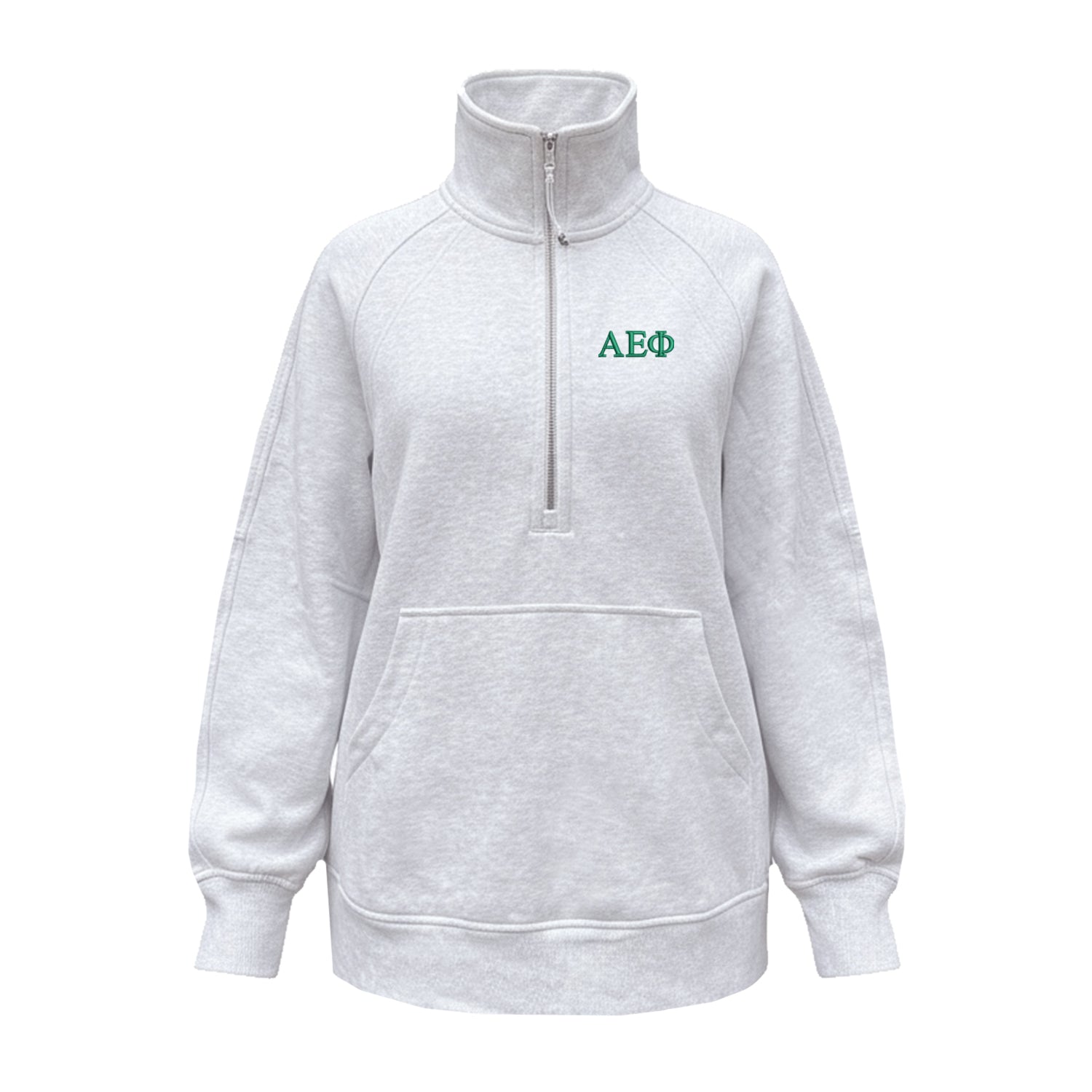 Serious about softness. This funnel-neck half zip is all about fleecy fabric and sinking in to a cozy oversized fit. Available in Heathered Core Ultra Light Grey with your Alpha Epsilon Phi letters embroidered in green thread.