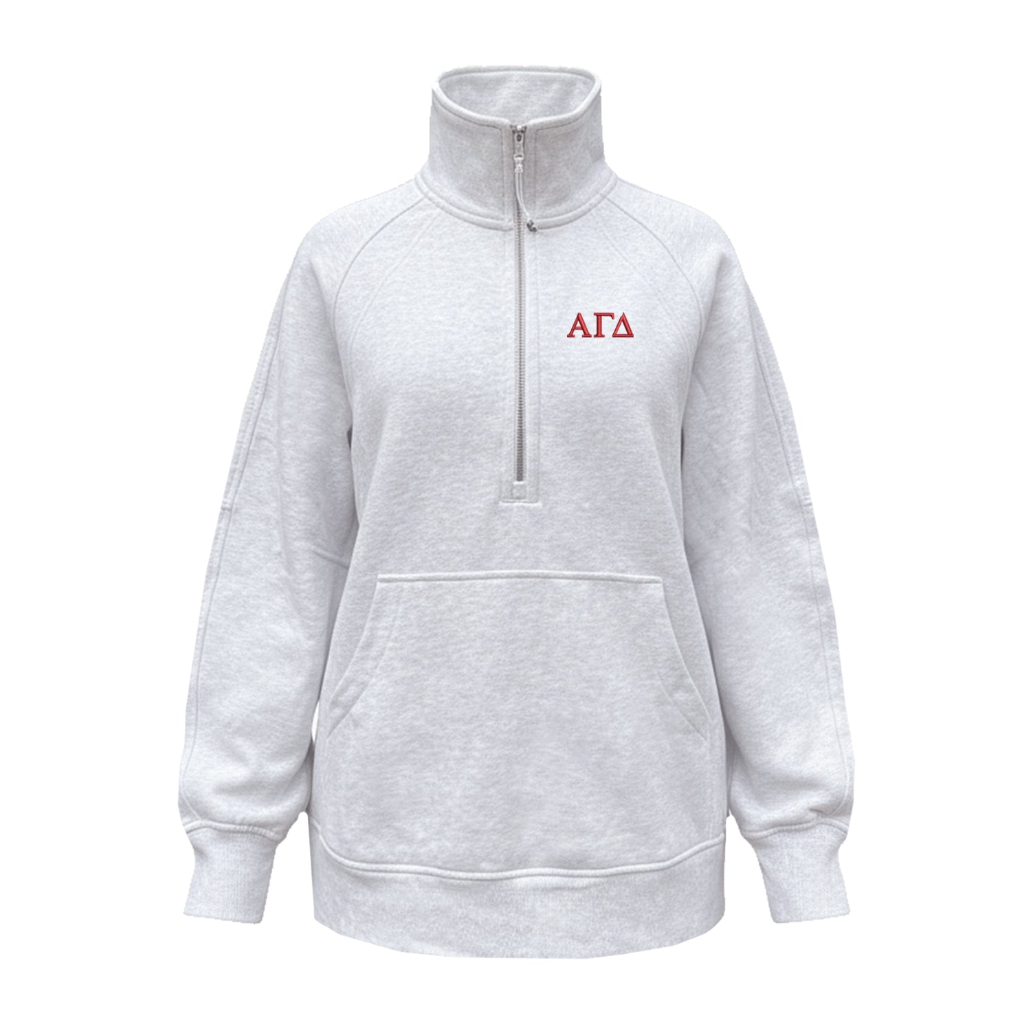 Serious about softness. This funnel-neck half zip is all about fleecy fabric and sinking in to a cozy oversized fit. Available in Heathered Core Ultra Light Grey with your Alpha Gamma Delta letters embroidered in red thread.