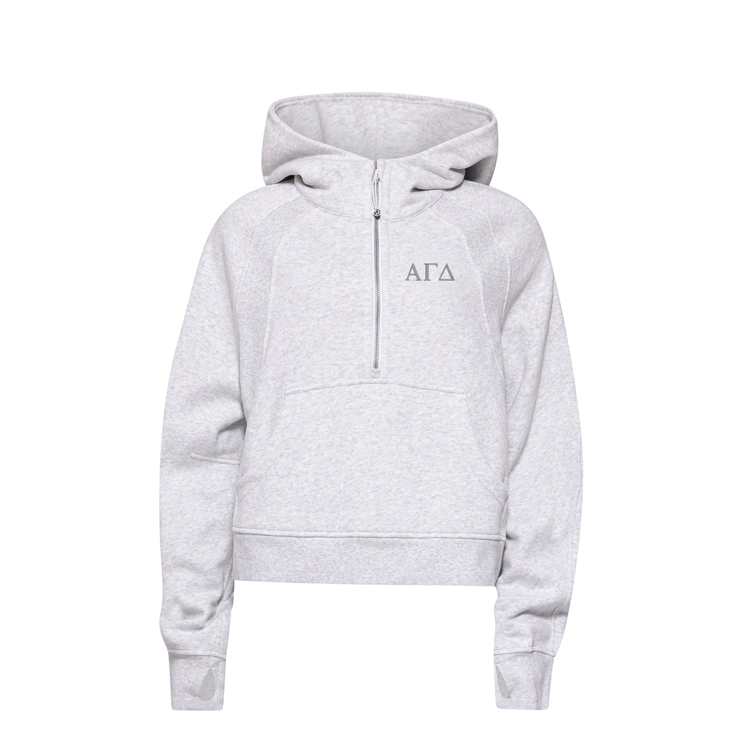 Made by lululemon, brought to you by Sorority Letters Shop, this is the must have Alpha Gamma Delta hoodie of the season. Serious about softness, this lululemon half-zip hooded sweatshirt is all about fleecy fabric. An exaggerated fit that feels extra roomy is not too short, not too long, just right around the waistband. Available in Heathered Core Ultra Light Grey with your Alpha Gamma Delta Greek letters embroidered in red or tonal grey on grey...lululemon yogo embroidered on the back of the hood.