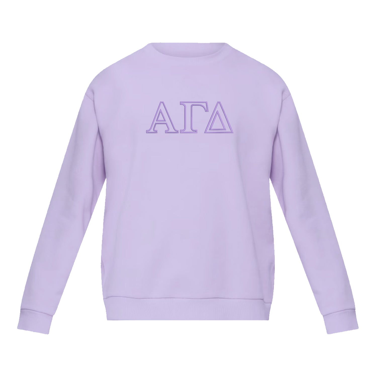 Made by lululemon, brought to you by Sorority Letters Shop.  Consider your classic sweats officially elevated.  Alpha Gamma Delta Steady State puts softness first to bring comfort wherever you go.  Perfectly oversized unisex fit.  Cozy fleece is brushed on the inside for next-to-skin warmth.  Crewneck sweatshirt in lavender frost is embroidered with large Alpha Gamma Delta outlined letters in tonal lavender.  Soft, cozy, casual.