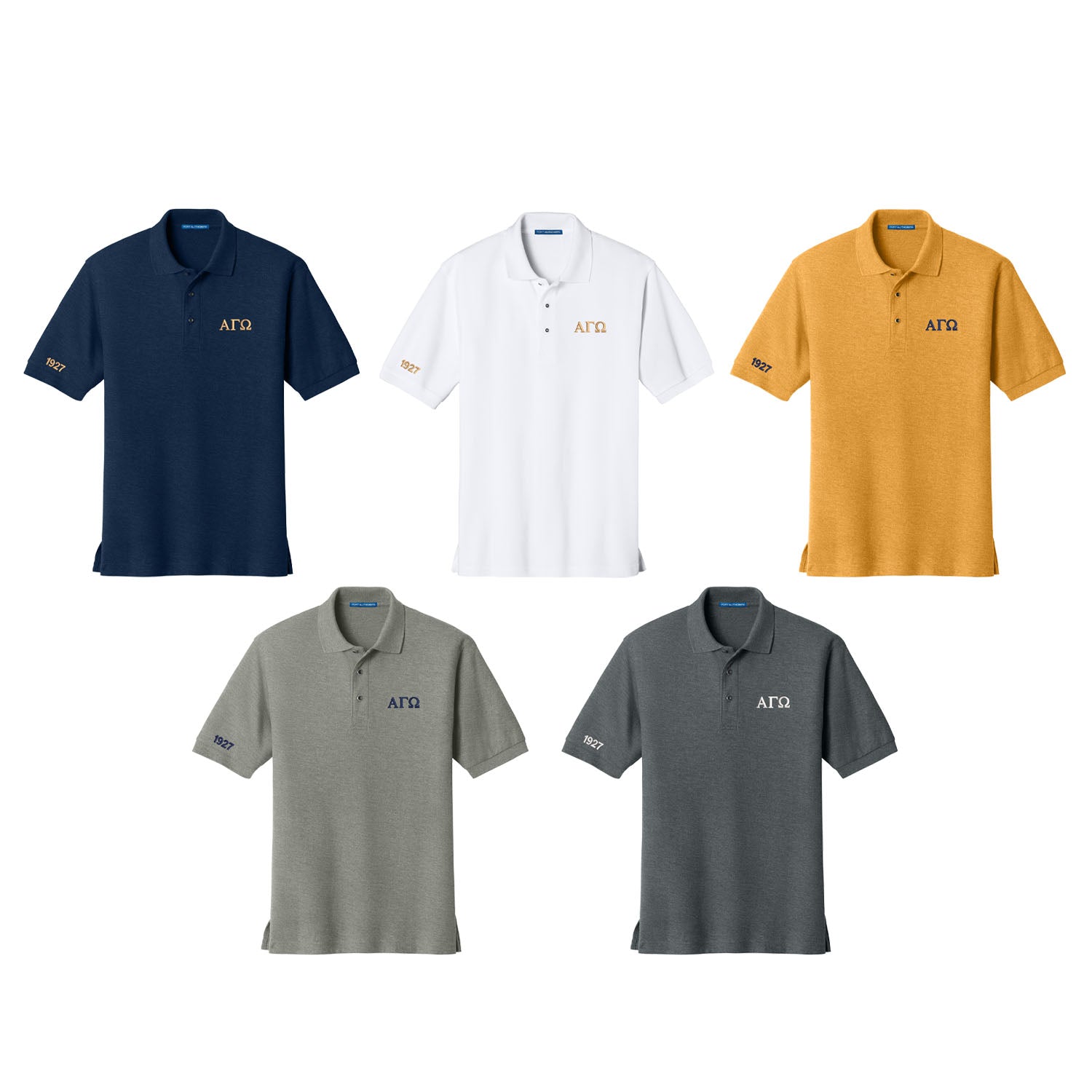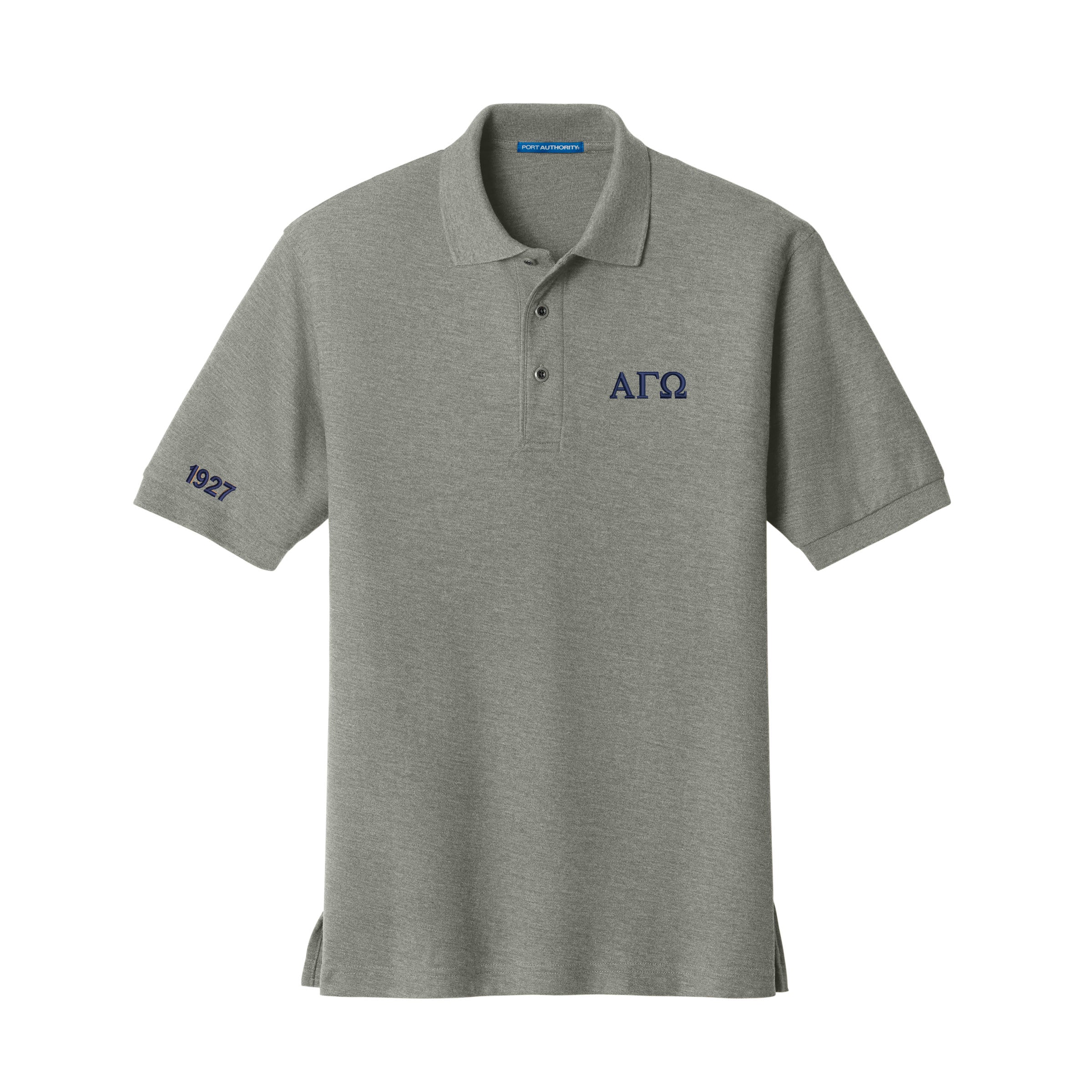Soft cotton pique polo comes embroidered with Alpha Gamma Omega Greek letters on the left chest and 1927 embroidered on the right sleeve.