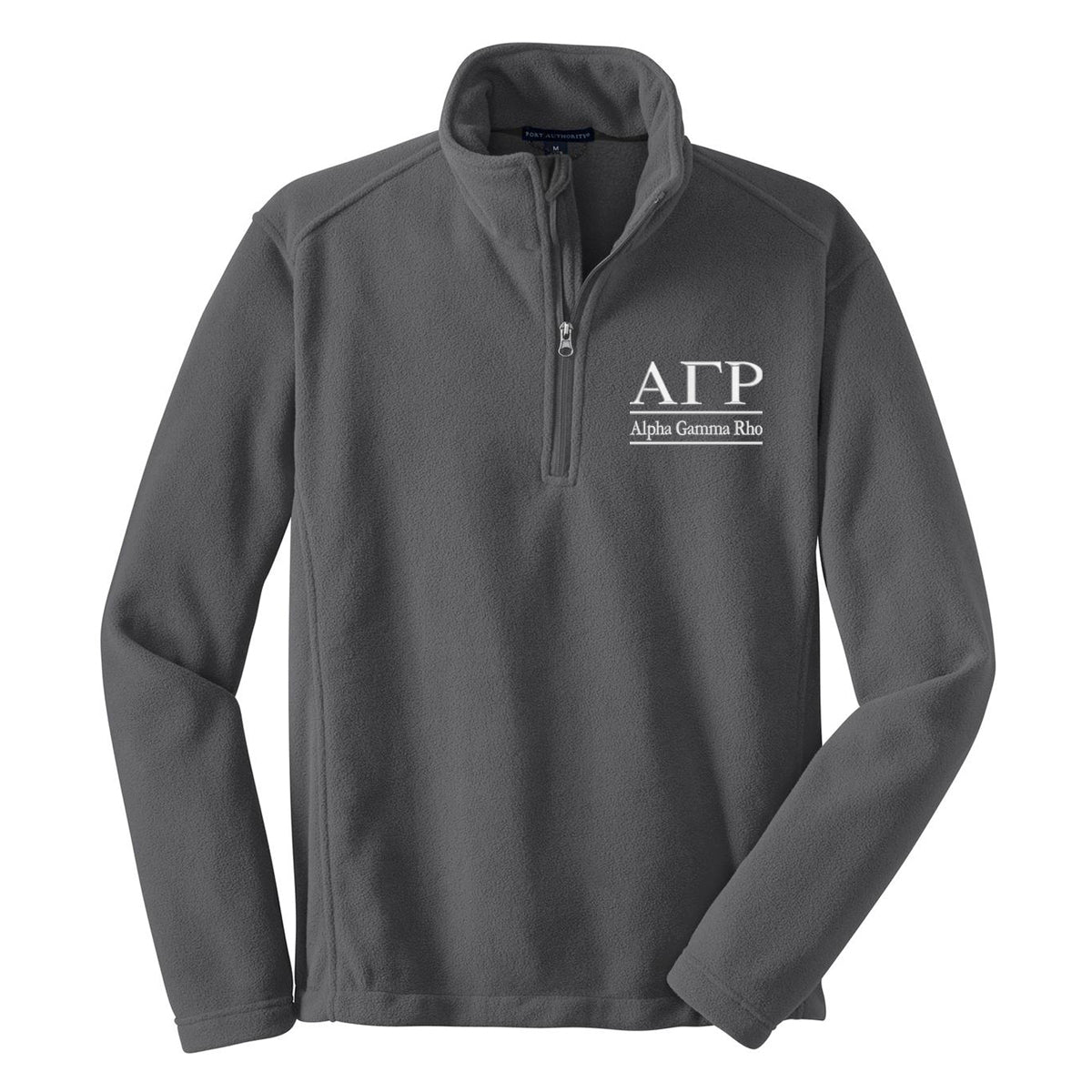 Medium weight fleece quarter zip with Alpha Gamma Rho Greek letters and name embroidered on the left chest.