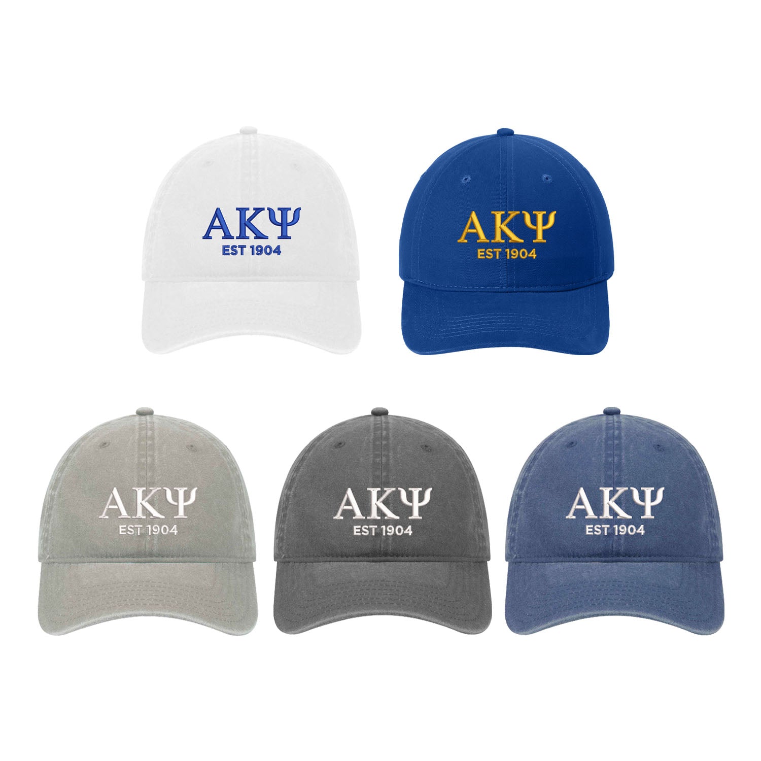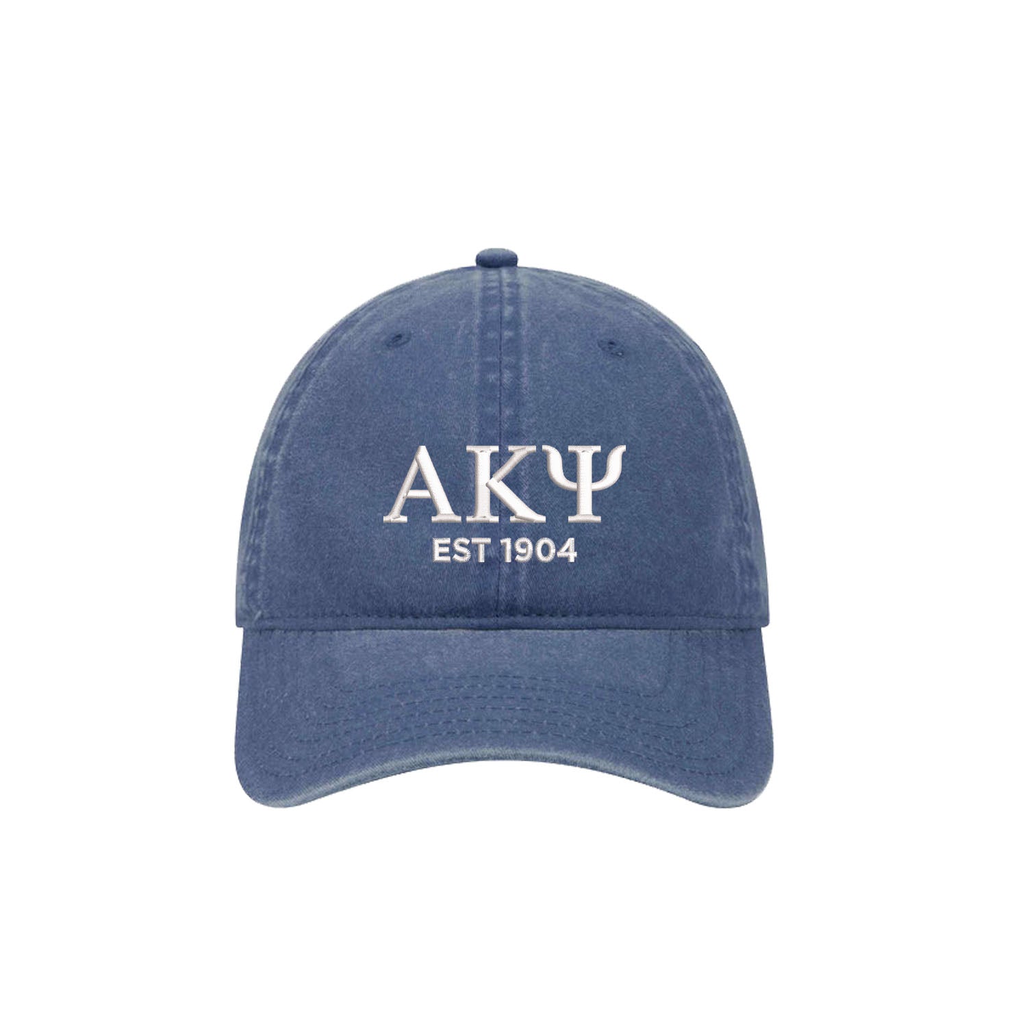 Choose from beach washed or solid cotton twill hat with embroidered Alpha Kappa Psi fraternity letters and your established year Our popular pigment dyed garment washed cap has a lived-in look with a soft crown lining. Great for all year round. Makes a great AKPsi gift!
