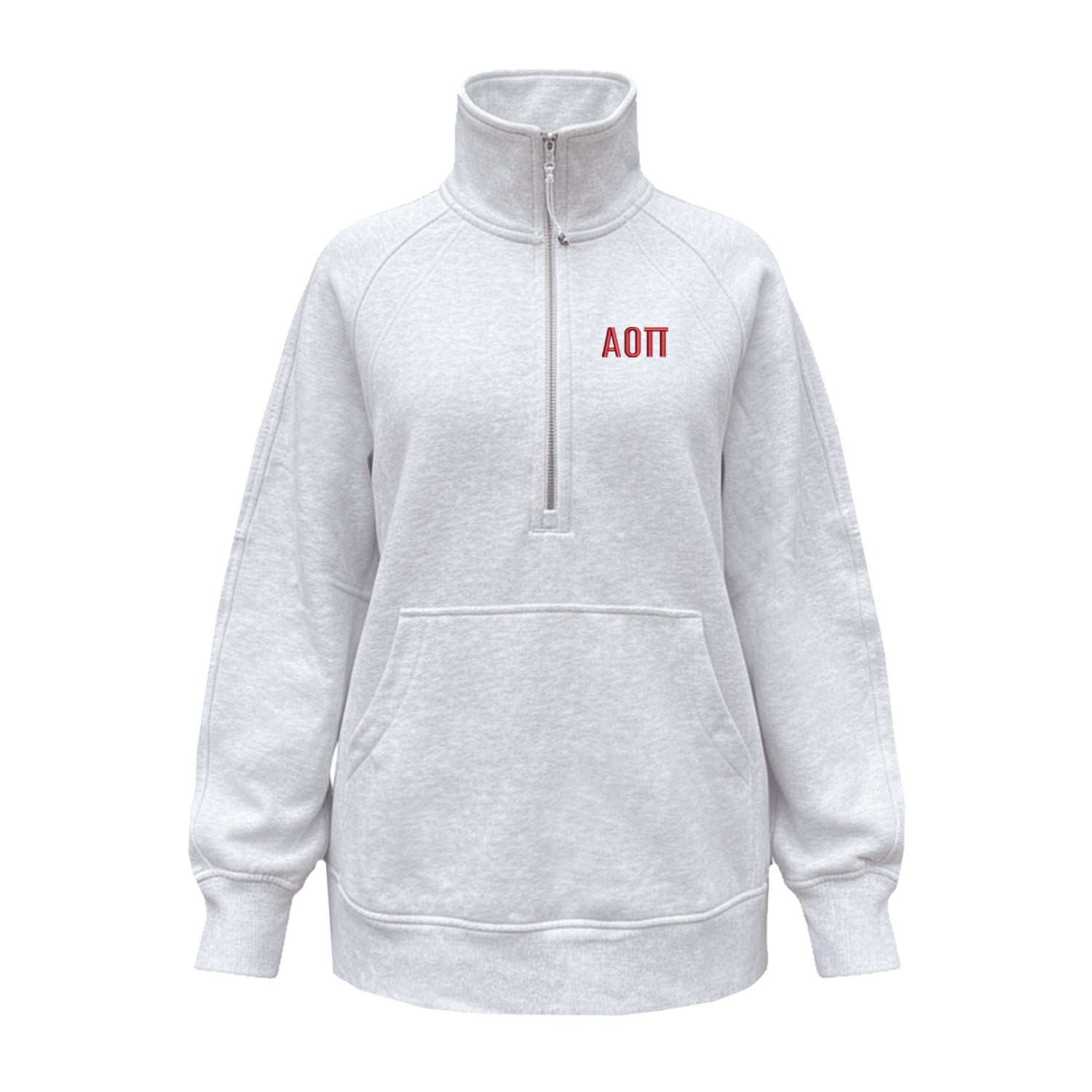 Serious about softness. This funnel-neck half zip is all about fleecy fabric and sinking in to a cozy oversized fit. Available in Heathered Core Ultra Light Grey with your Alpha Omicron Pi letters embroidered in red thread.