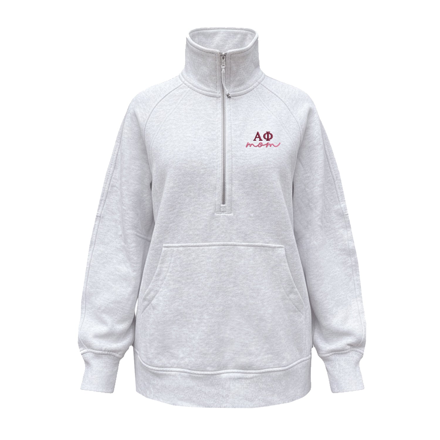 Made by lululemon, brought to you by Sorority Letters Shop, this long scuba funnel neck comes embroidered with the Alpha Phi Greek letters MOM design.