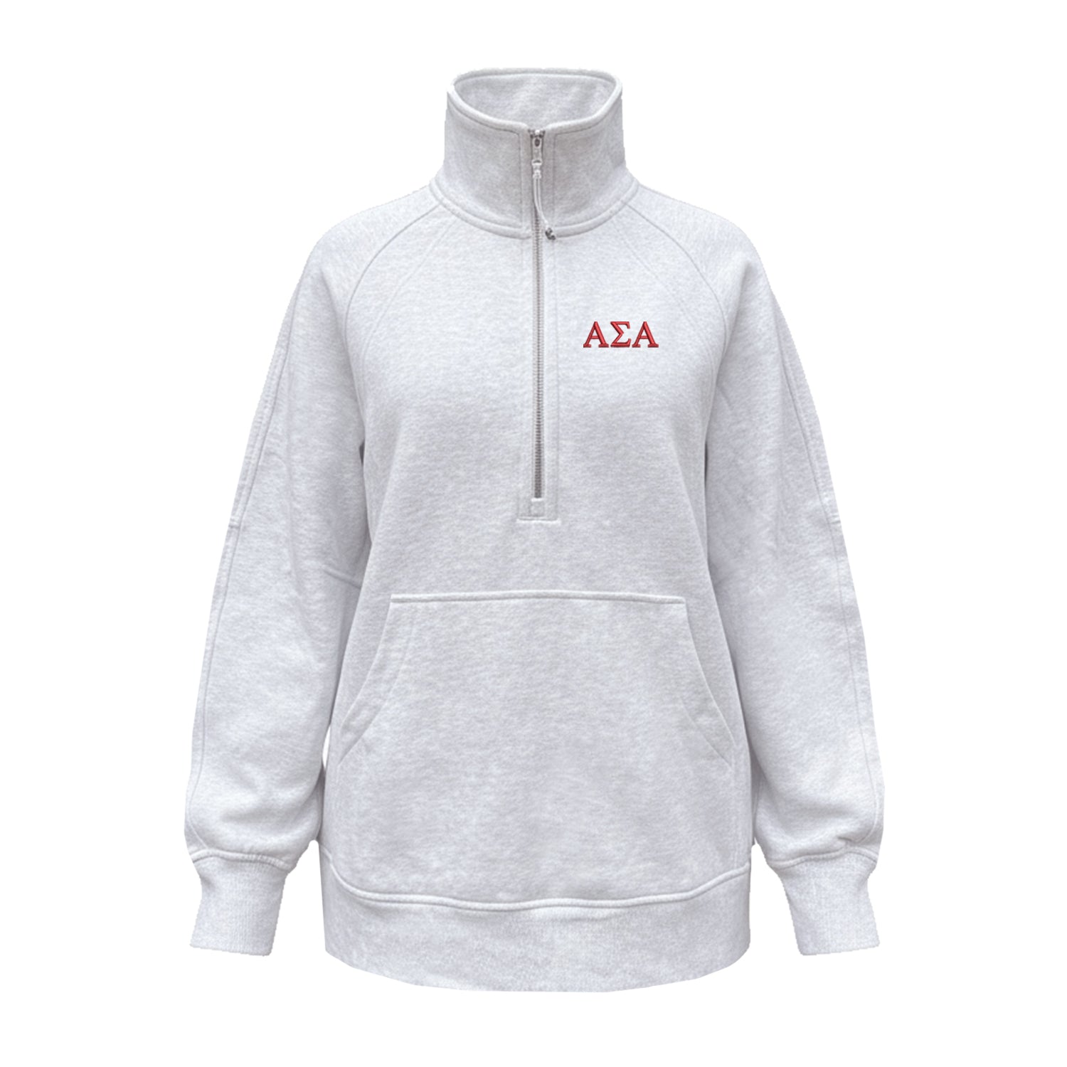 Serious about softness. This funnel-neck half zip is all about fleecy fabric and sinking in to a cozy oversized fit. Available in Heathered Core Ultra Light Grey with your Alpha Sigma Alpha letters embroidered in red thread.