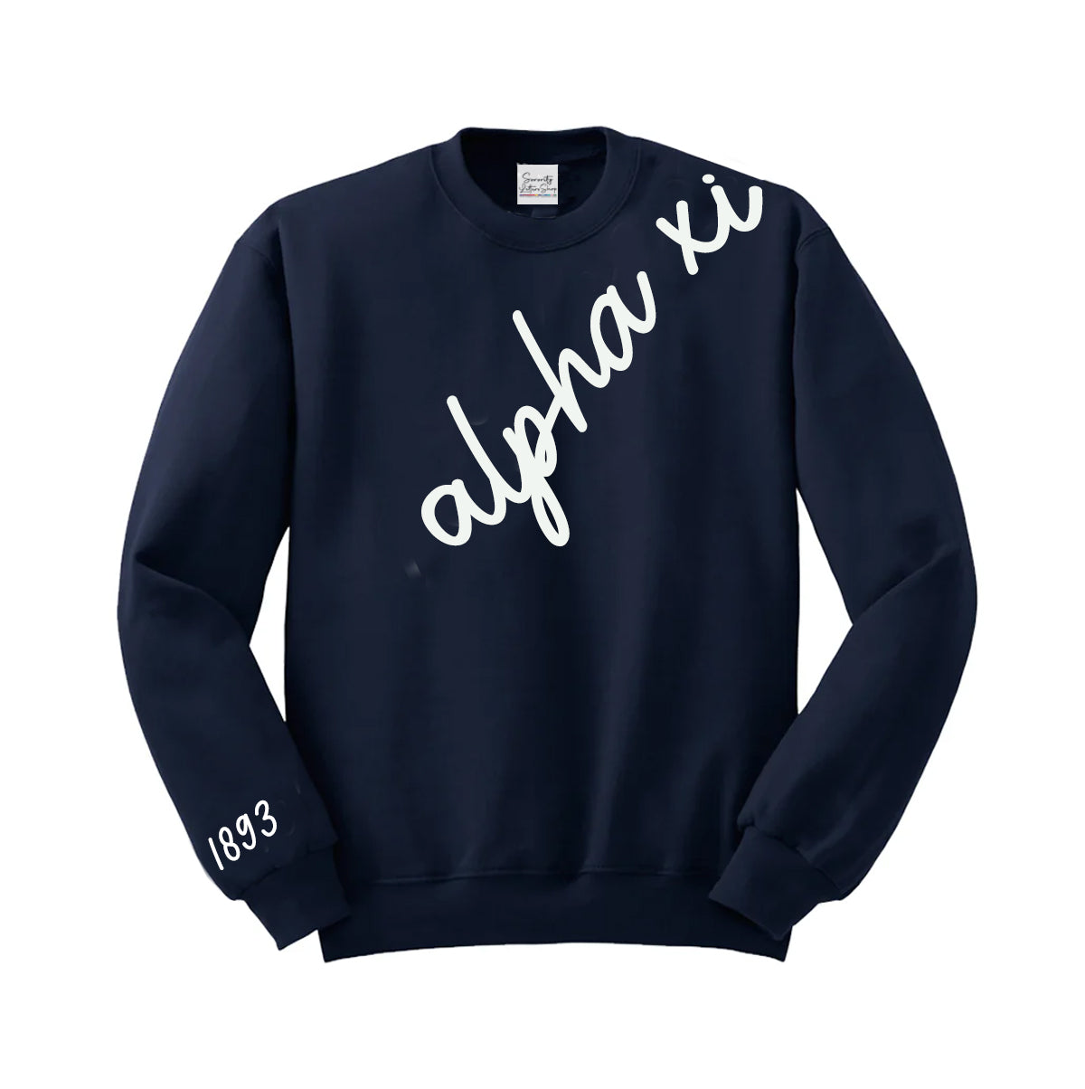 It's time to update your Alpha Xi Delta crewneck collection! Available now...our 1893 Alpha Xi Delta sweatshirt available in navy with "alpha xi" and 1893 printed in white.