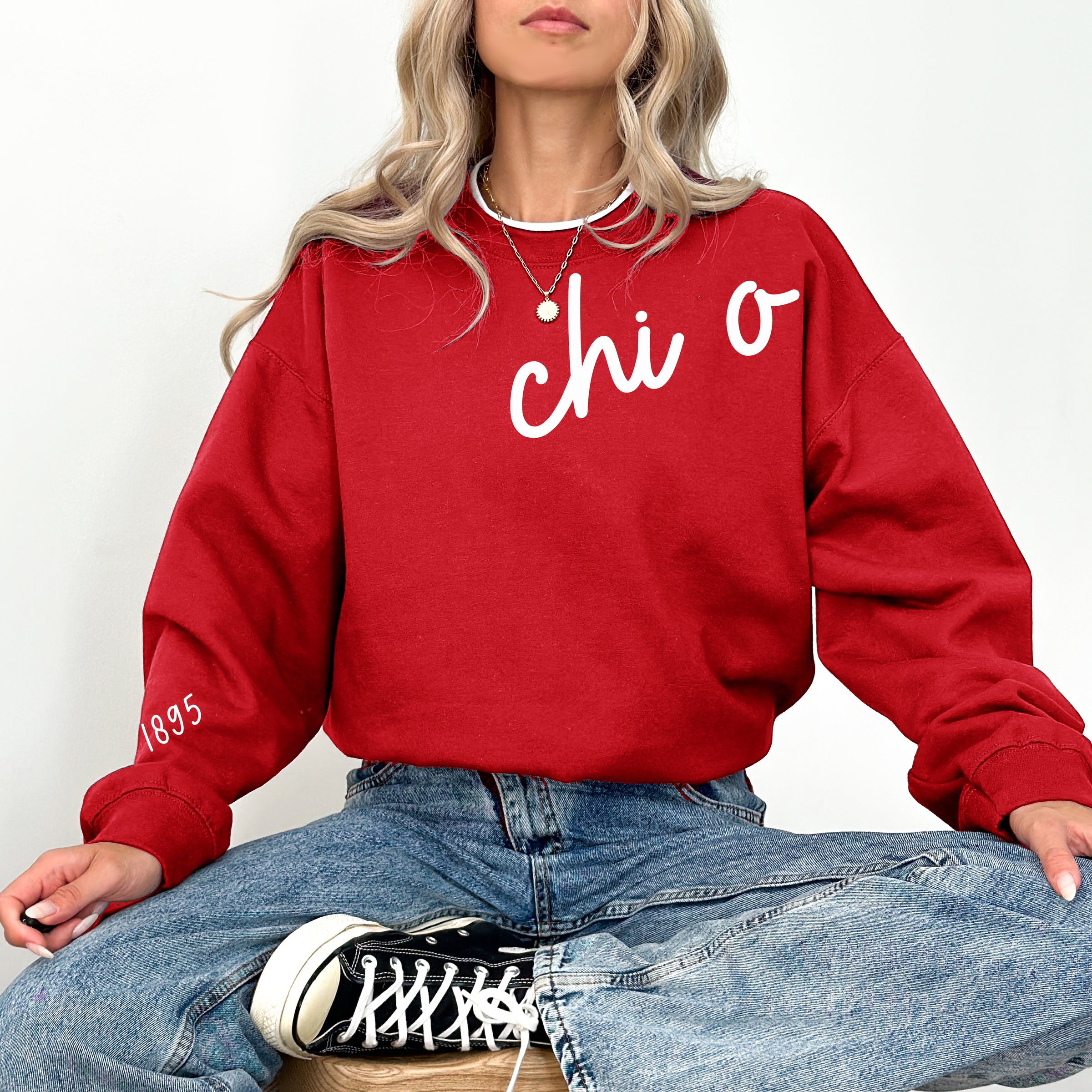 It's time to update your Chi Omega crewneck collection! Available now...our Chi O 1895 crewneck available in red with white print