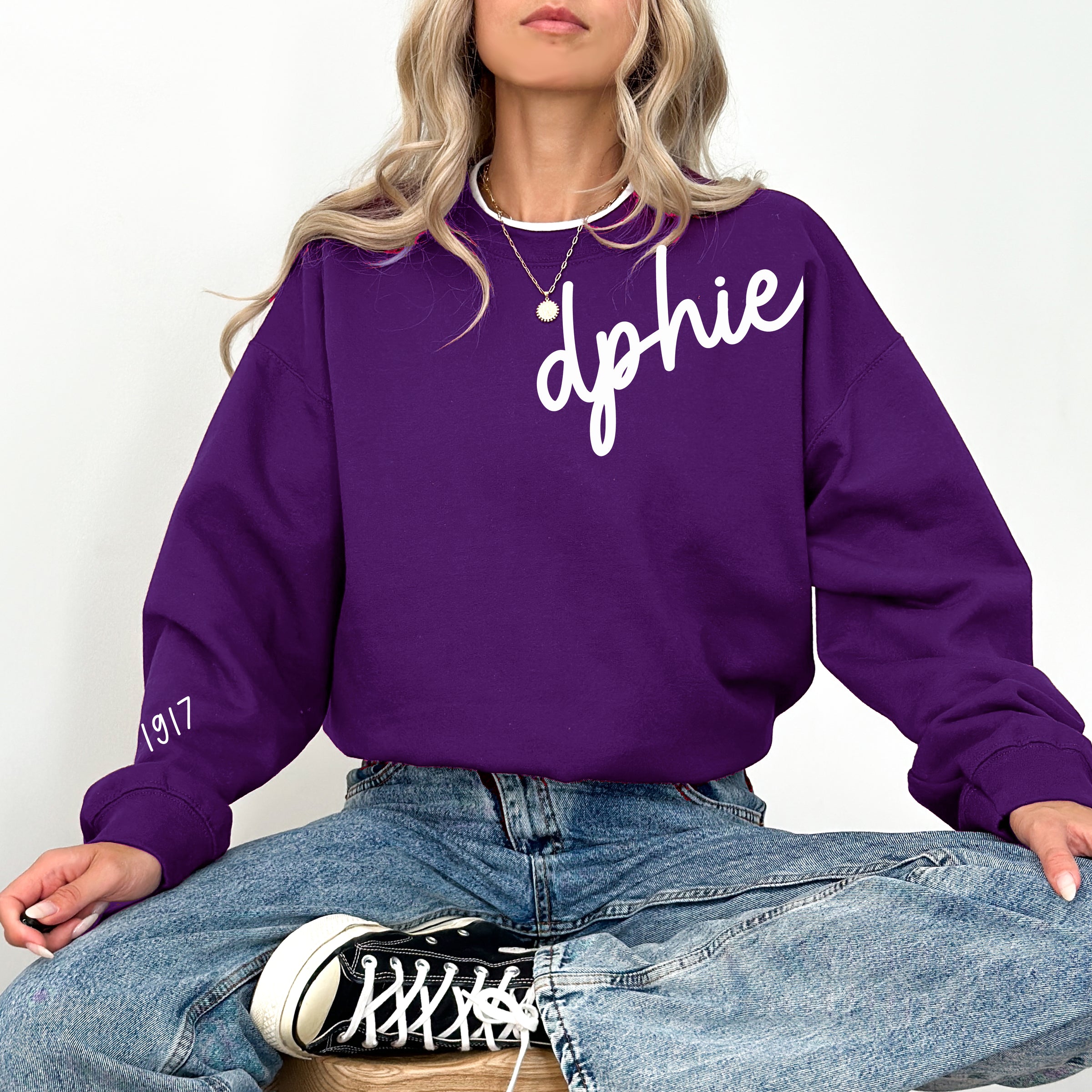It's time to update your Delta Phi Epsilon crewneck collection! Available now...our dphie 1917 crewneck available in purple with white print