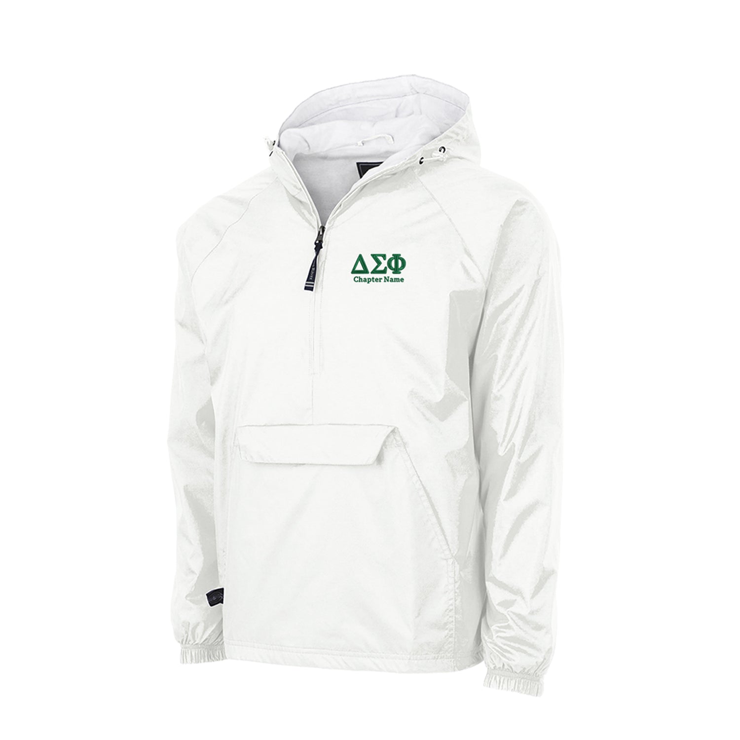 When adding the windbreaker to your cart, there will be a box for a "customization note." Type in your chapter name you would like under the Delta Sigma Phi Greek letters. Or you can type it in the "Order Special Instructions" when checking out.