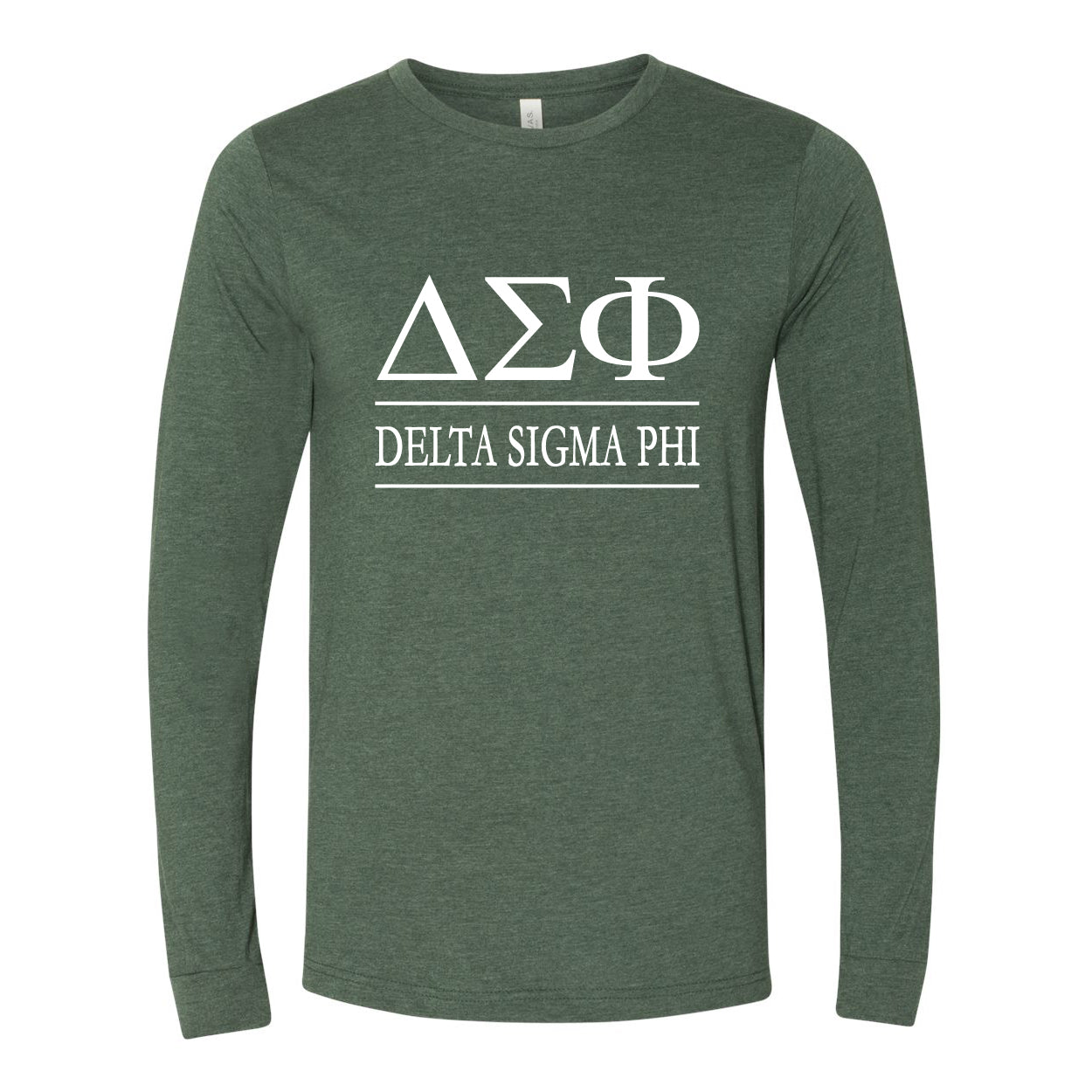 Long sleeve t-shirt with Delta Sigma Phi Greek letters and name printed in white across the chest.  Heather Forest Green with White Print.  Additional colors available upon request.