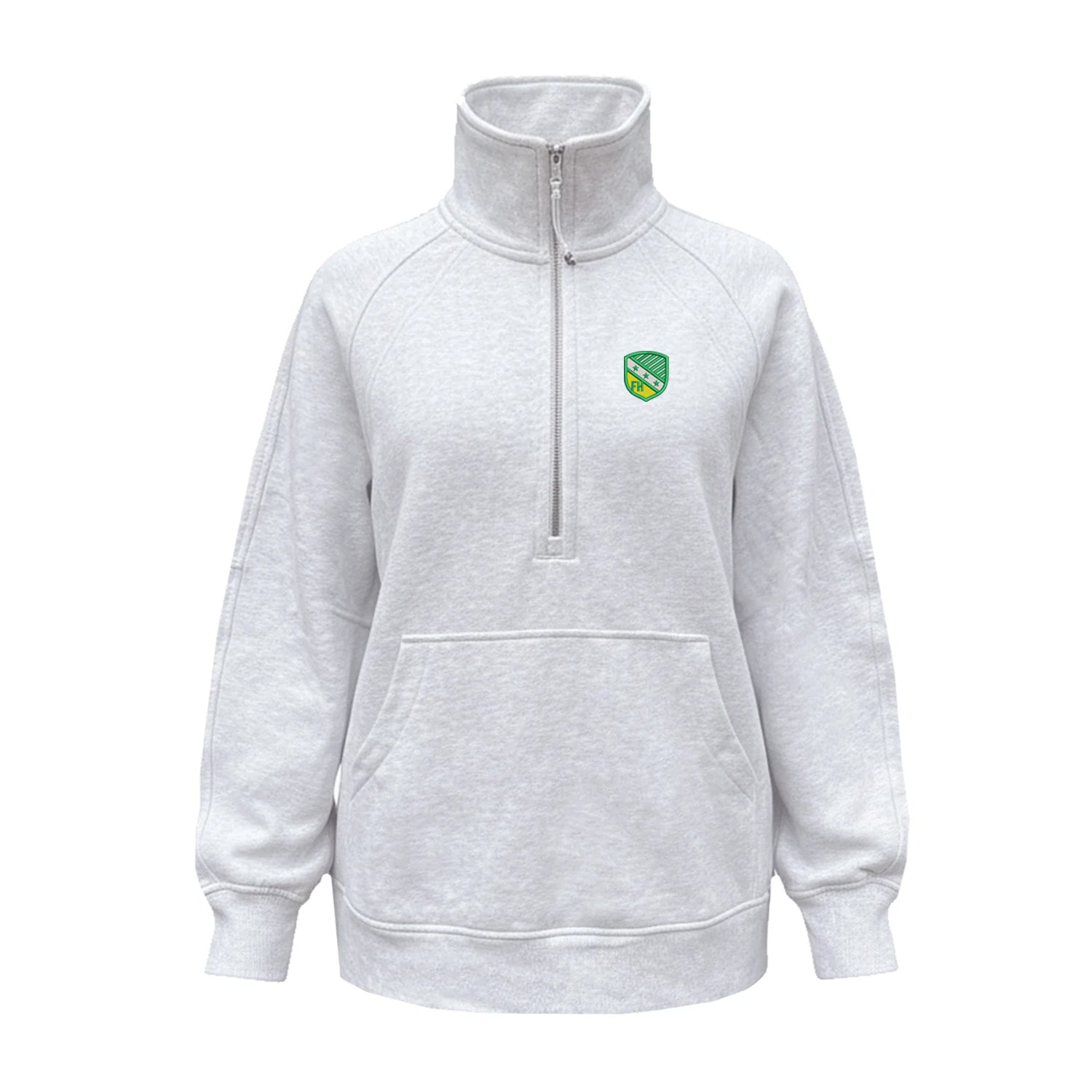 Serious about softness. This funnel-neck half zip is all about fleecy fabric and sinking in to a cozy oversized fit.  Available in Heathered Core Ultra Light Grey with your FarmHouse shield embroidered.
