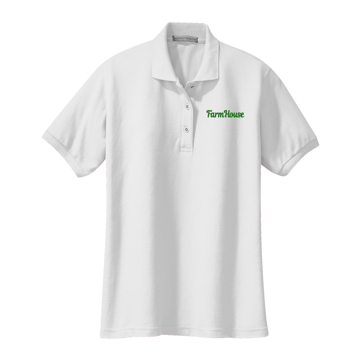 Soft to touch cotton pique ladies polo comes embroidered with FarmHouse in script