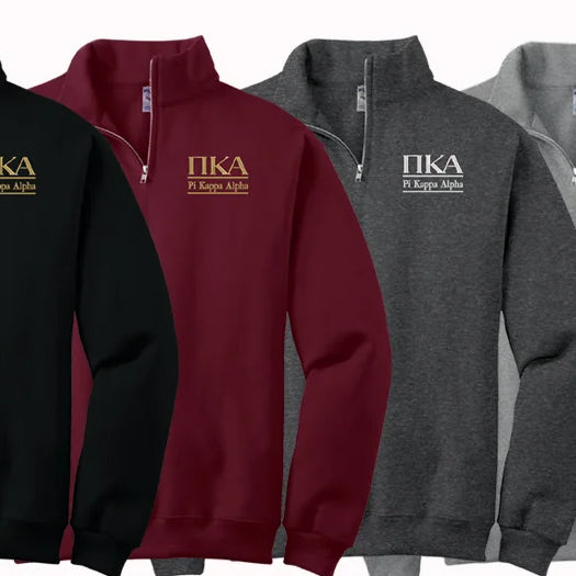 Pi Kappa Alpha Quart Zip available in maroon and and embroidered with PKA Greek letters and Pi Kappa Alpha under the letters. This pullover is a lightweight sweatshirt making it the perfect gift for your new Pike pledge. Wear it all year round.