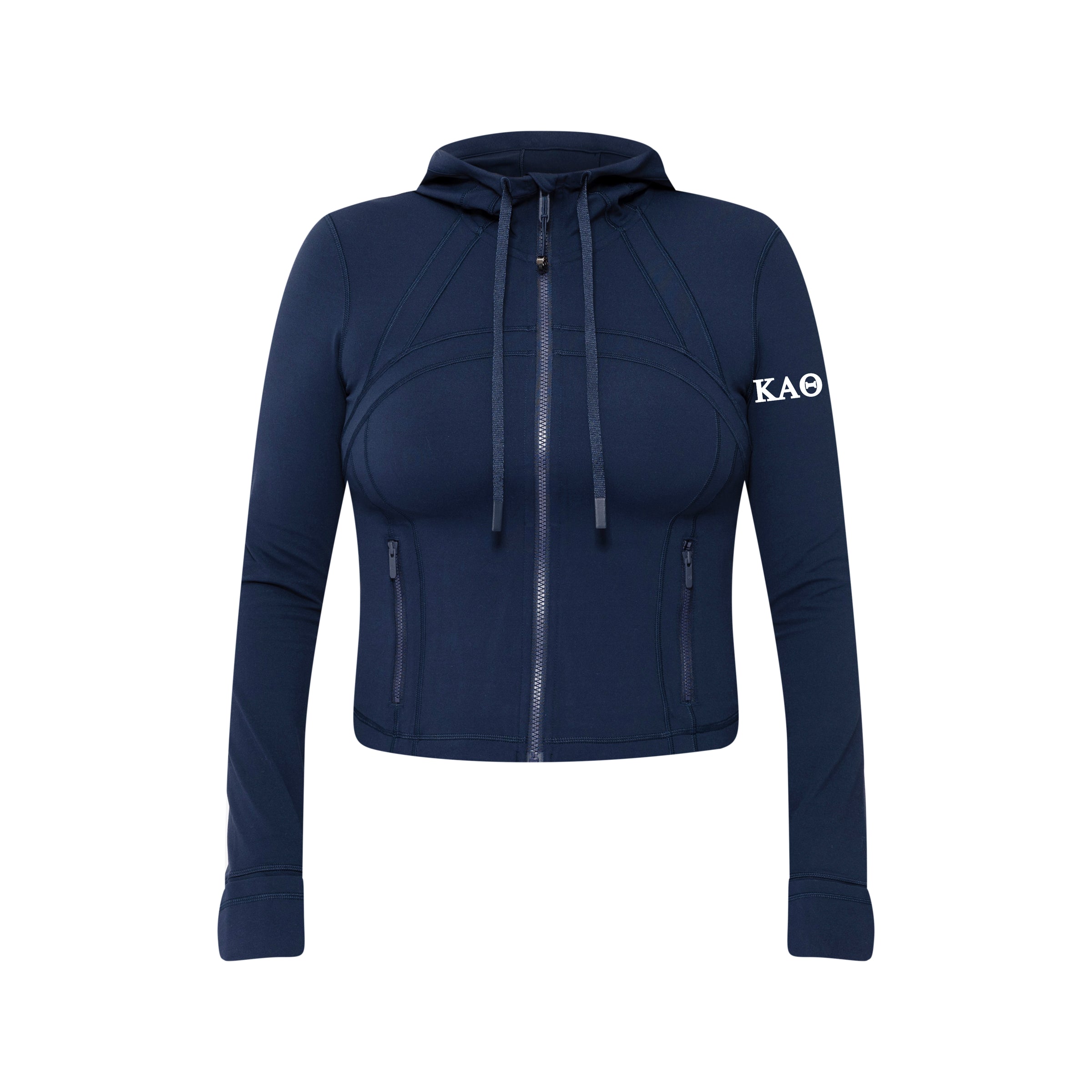 Feeling adventurous? This cropped version of our fan-favourite Kappa Alpha Theta Hooded Define Jacket is made of breathable fabric that's stretchy and ready for whatever you've got in store. Made by lululemon, brought to you by Sorority Letters Shop. Perfect for campus or your next Gamma Phi event. Available in navy with the Kappa Alpha Theta Greek letters printed on the left sleeve in white.