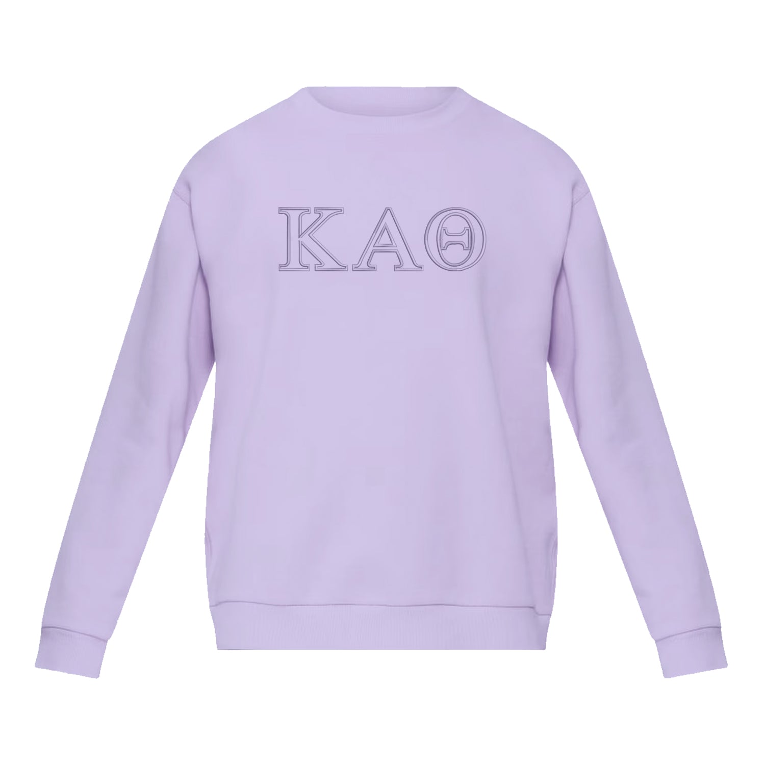 Made by lululemon, brought to you by Sorority Letters Shop.  Consider your classic sweats officially elevated.  Kappa Alpha Theta Steady State puts softness first to bring comfort wherever you go.  Perfectly oversized unisex fit.  Cozy fleece is brushed on the inside for next-to-skin warmth.  Crewneck sweatshirt in lavender frost is embroidered with large Kappa Alpha Theta outlined letters in tonal lavender.  Soft, cozy, casual.
