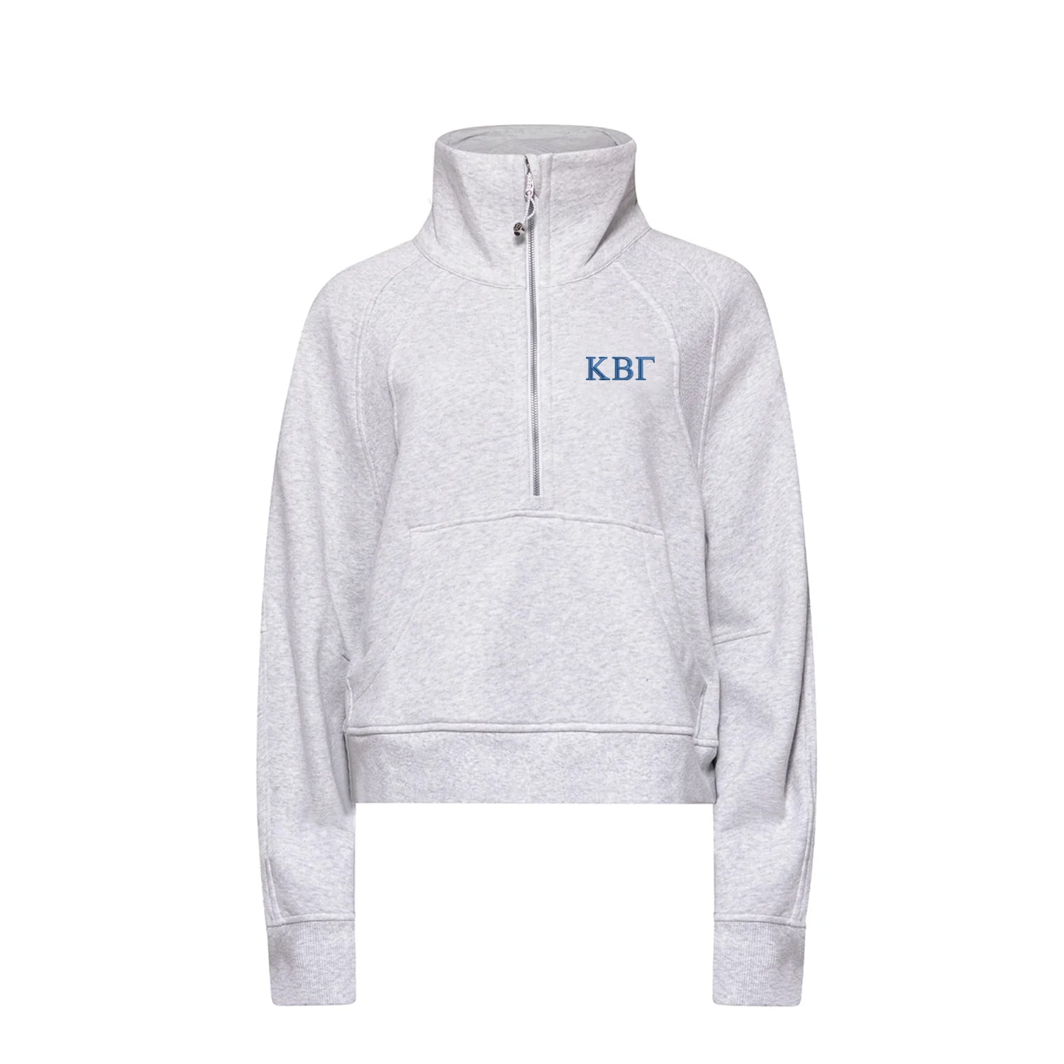 Made by lululemon, brought to you by Sorority Letters Shop, this is the must have Kappa Beta Gamma sweatshirt of the season. Classic lululemon oversized, crop length, half-zip funnel neck comes embroidered with blue Kappa Beta Gamma letters. With an oversized fit, a cozy funnel neck, and the soft fabric you love, this Scuba silhouette maximizes post-practice comfort.