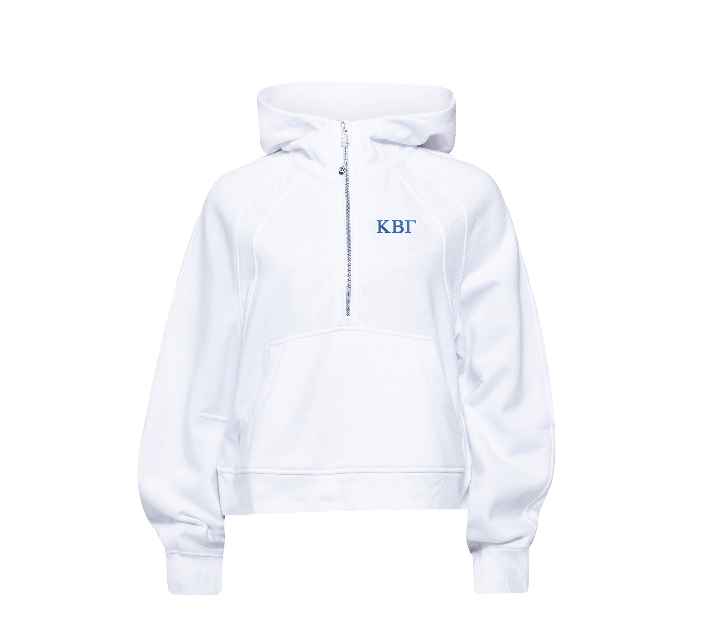 Made by lululemon, brought to you by Sorority Letters Shop, this is the must have Kappa Beta Gamma hoodie of the season. Serious about softness, this lululemon half-zip hooded sweatshirt is all about fleecy fabric. An exaggerated fit that feels extra roomy is not too short, not too long, just right around the waistband. Available in white with your Kappa Beta Gamma Greek letters embroidered in blue.