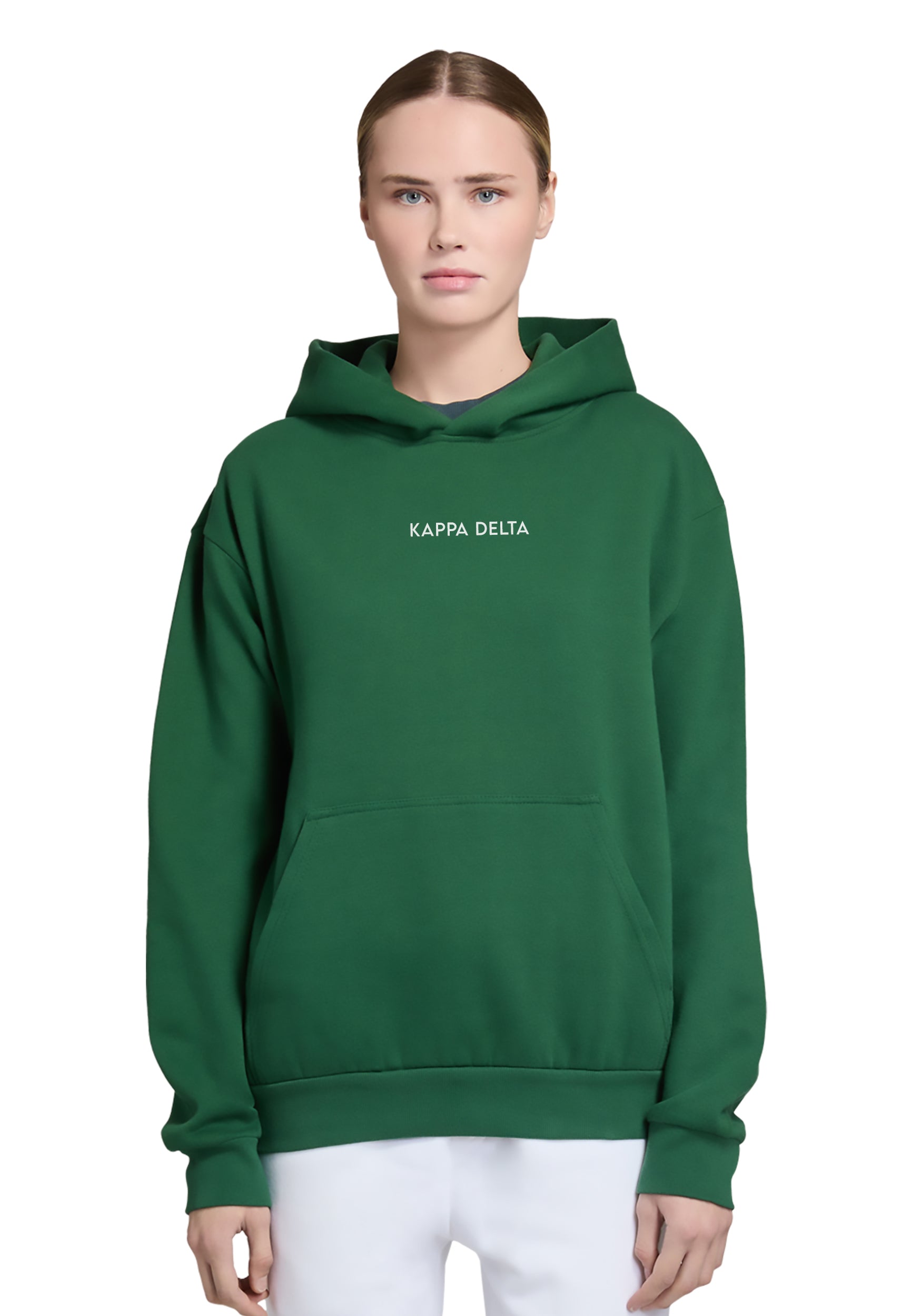 Your Kappa Delta streetwear has been elevated...introducing the Urban Pullover Hoodie. Available in Forest green with KAPPA DELTA embroidered across the front in off-white. At 10 oz, this hoodie packs a punch, is generously sized, and tightly spun for added durability, wear after wear.