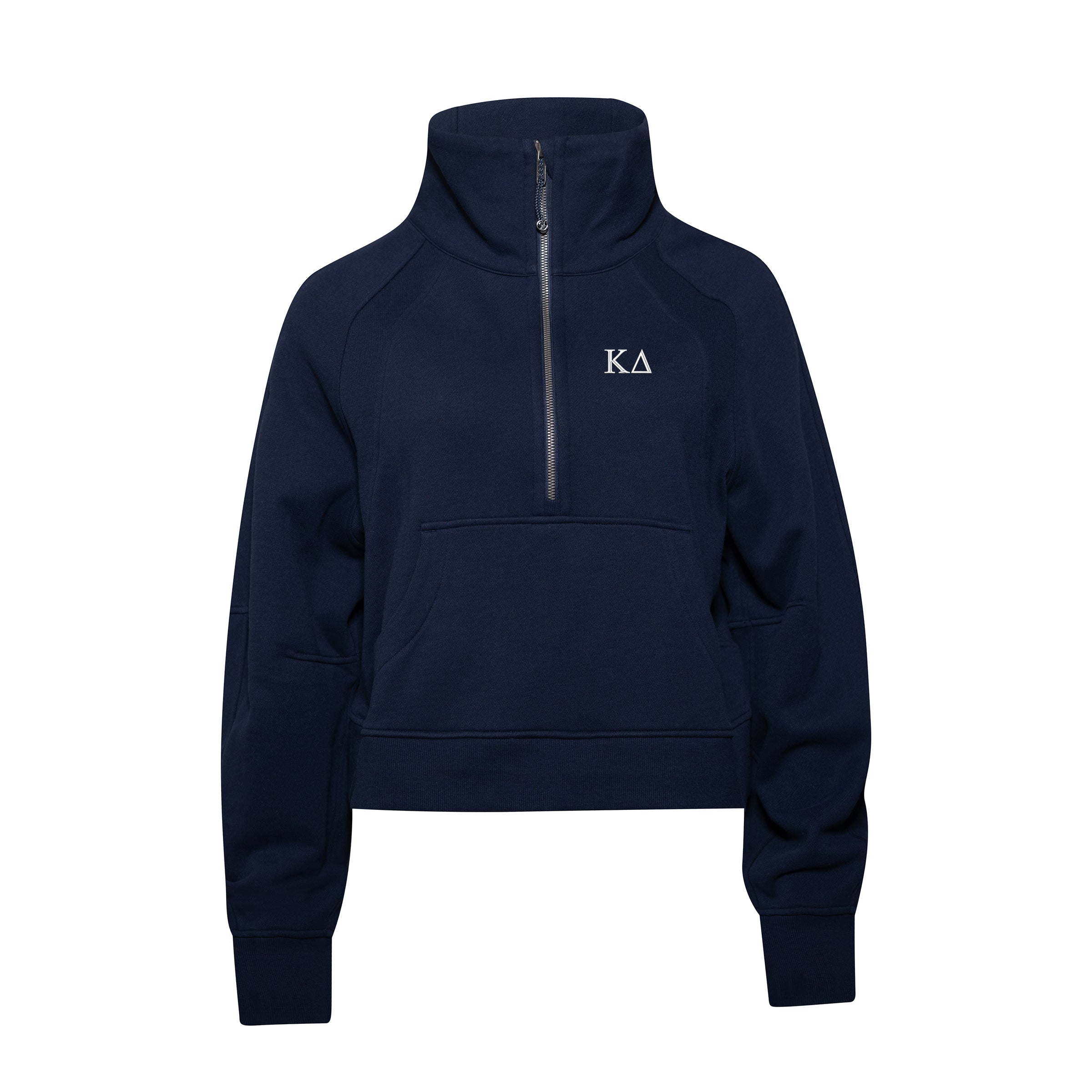 Made by lululemon, brought to you by Sorority Letters Shop, this is the must have Kappa Delta sweatshirt of the season.  Classic lululemon oversized, crop length, half-zip funnel neck comes embroidered with the Kappa Delta greek letters on the front in white. With an oversized fit, a cozy funnel neck, and the soft fabric you love, this Scuba silhouette maximizes post-practice comfort.