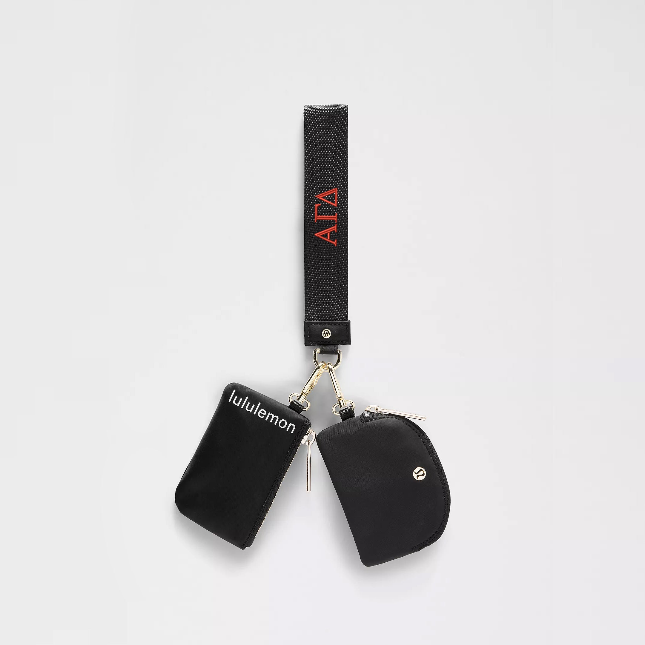 Never lose your keys again and be ready to go with the flick of a wrist. This lululemon Alpha Gamma Delta wristlet comes with two zippered pouches to keep small items in place while you're on the move. Available in black with gold hardware and your Alpha Gamma Delta letters embroidered in red.