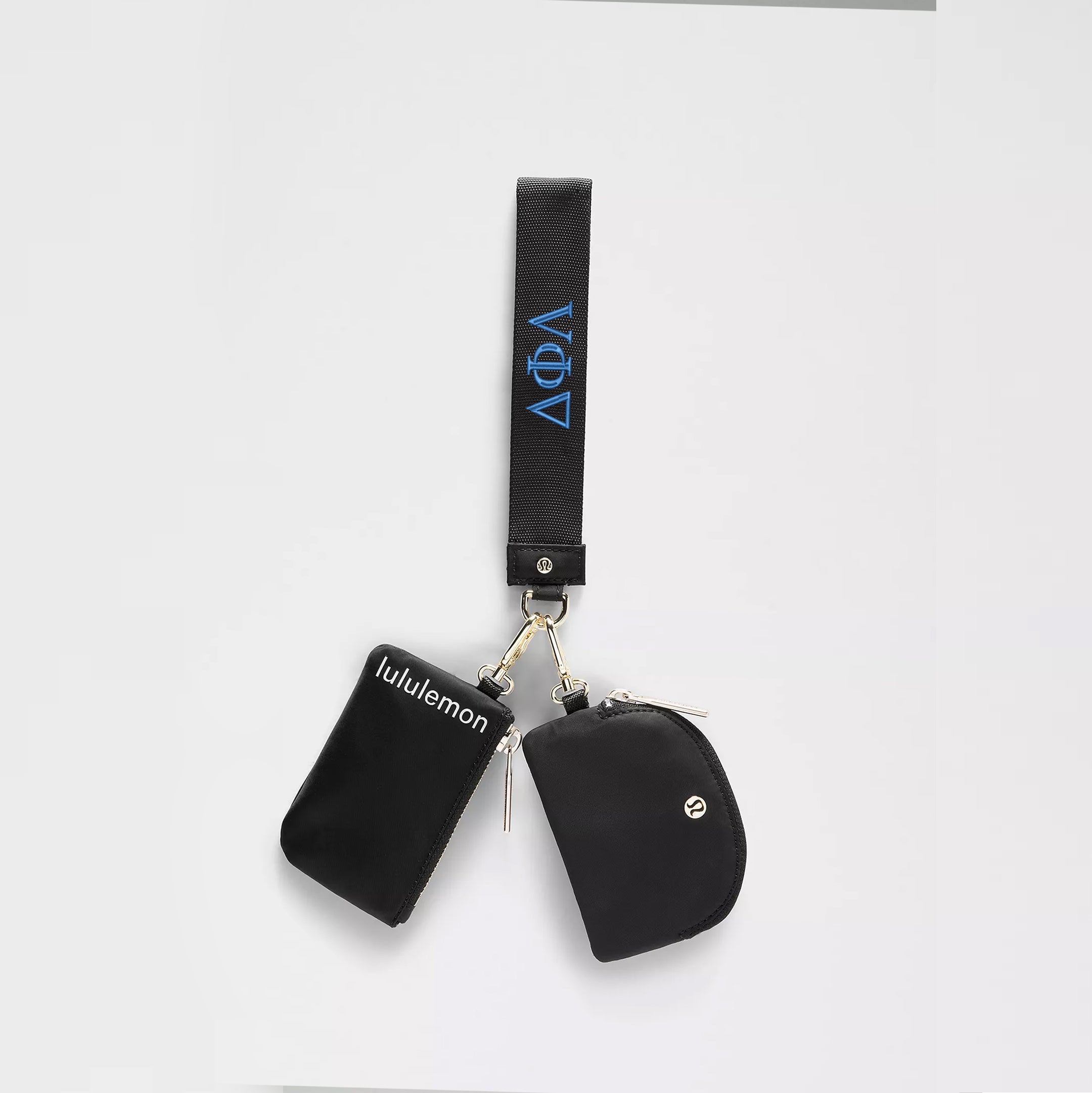 Never lose your keys again and be ready to go with the flick of a wrist. This lululemon Delta Phi Lambda wristlet comes with two zippered pouches to keep small items in place while you're on the move. Available in black with gold hardware and your Delta Phi Lambda letters embroidered in blue.