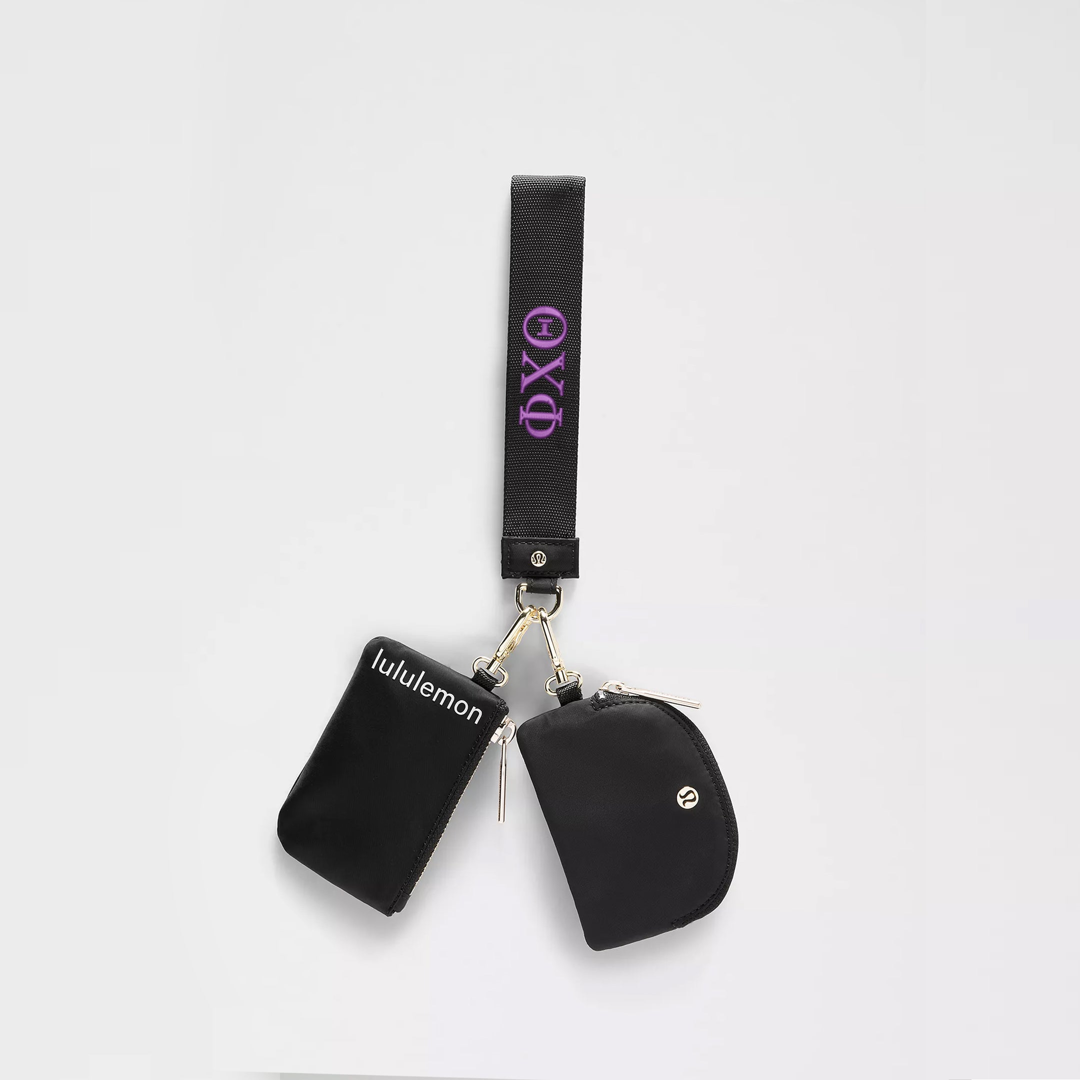 Never lose your keys again and be ready to go with the flick of a wrist. This lululemon Phi Chi Theta wristlet comes with two zippered pouches to keep small items in place while you're on the move. Available in black with gold hardware and your Phi Chi Theta letters embroidered in purple.