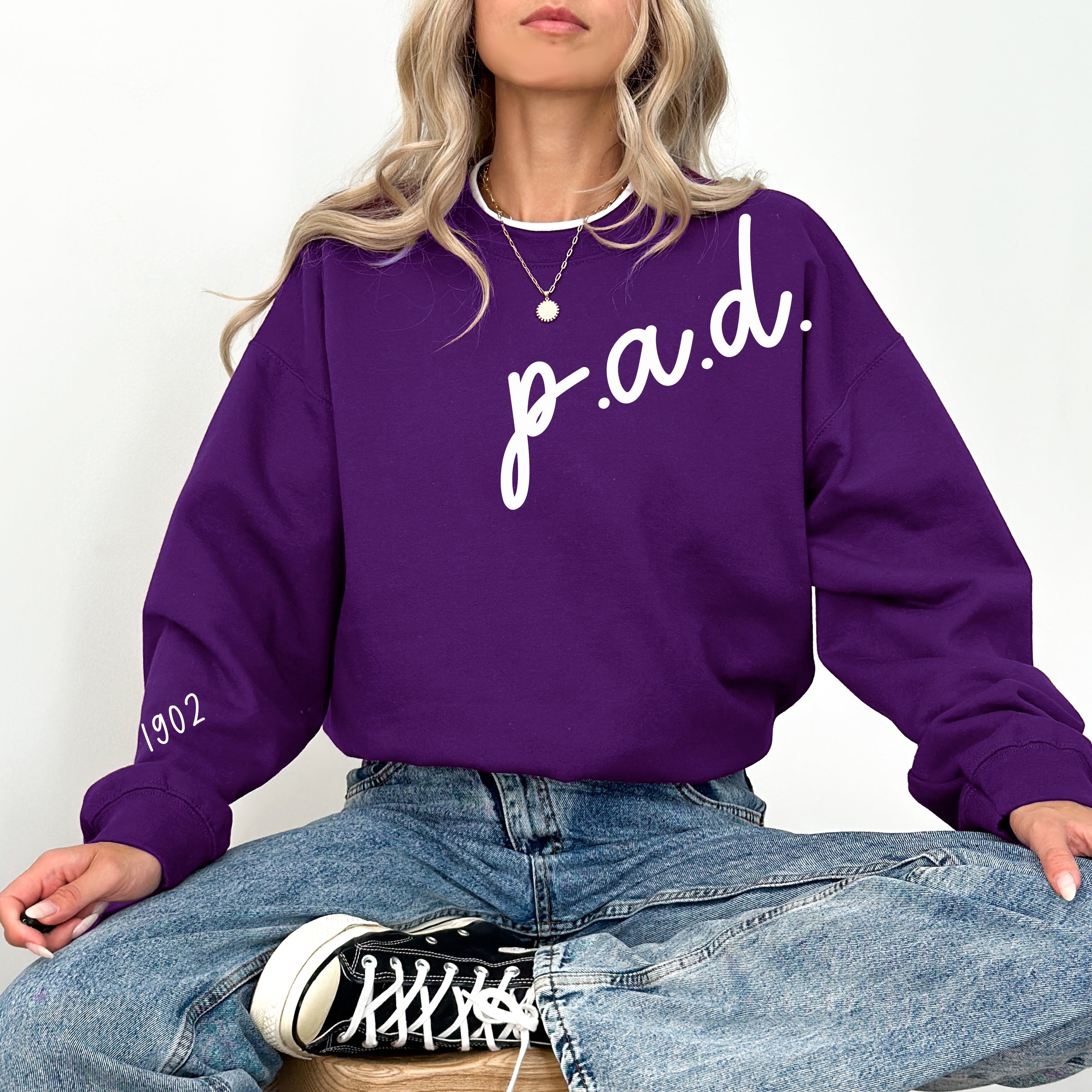 It's time to update your Phi Alpha Delta crewneck collection! Available now...our p.a.d. 1902 crewneck available in purple with white