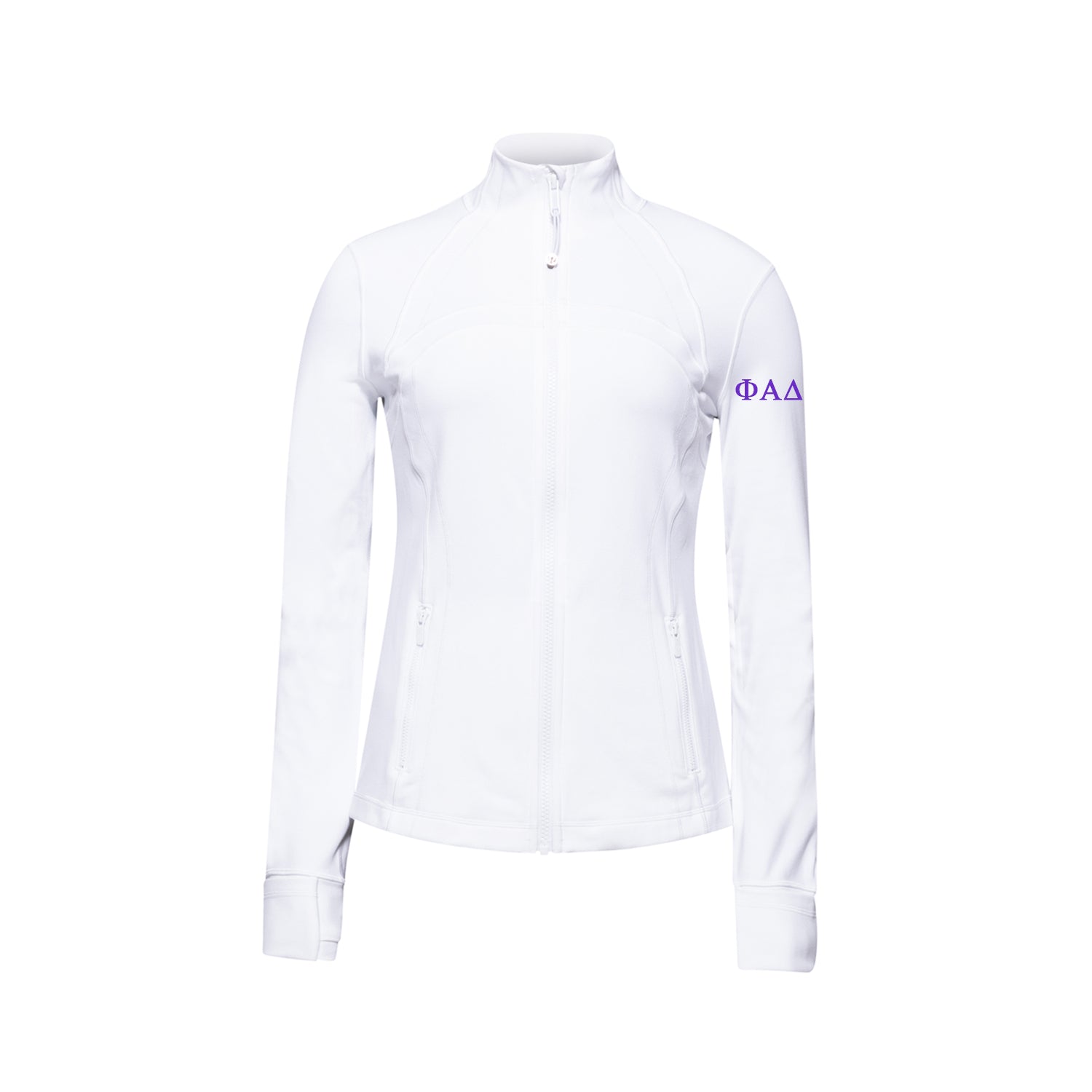 Made by lululemon, brought to you by Sorority Letters Shop. Whether you're up for adventure or ready for downtime, our fan-favourite Phi Alpha Delta Define Jacket has a feel-good fit that can do it all. Made of Luon fabric and sits below the waistband for moderate, everyday coverage. Perfect for campus or your next Tri Sig event. Available in White with the Phi Alpha Delta Greek letters printed on the left sleeve in purple.