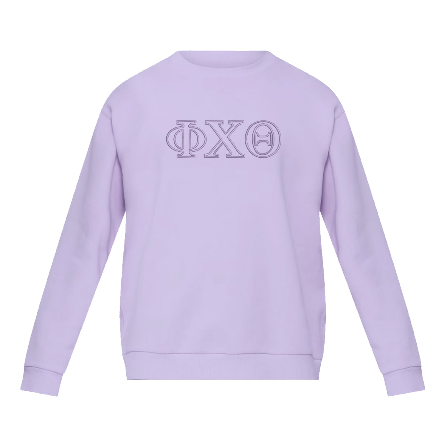 Made by lululemon, brought to you by Sorority Letters Shop. Consider your classic sweats officially elevated. Phi Chi Theta Steady State puts softness first to bring comfort wherever you go. Perfectly oversized unisex fit. Cozy fleece is brushed on the inside for next-to-skin warmth. Crewneck sweatshirt in lavender frost is embroidered with large Phi Chi Theta outlined letters in tonal lavender. Soft, cozy, casual.