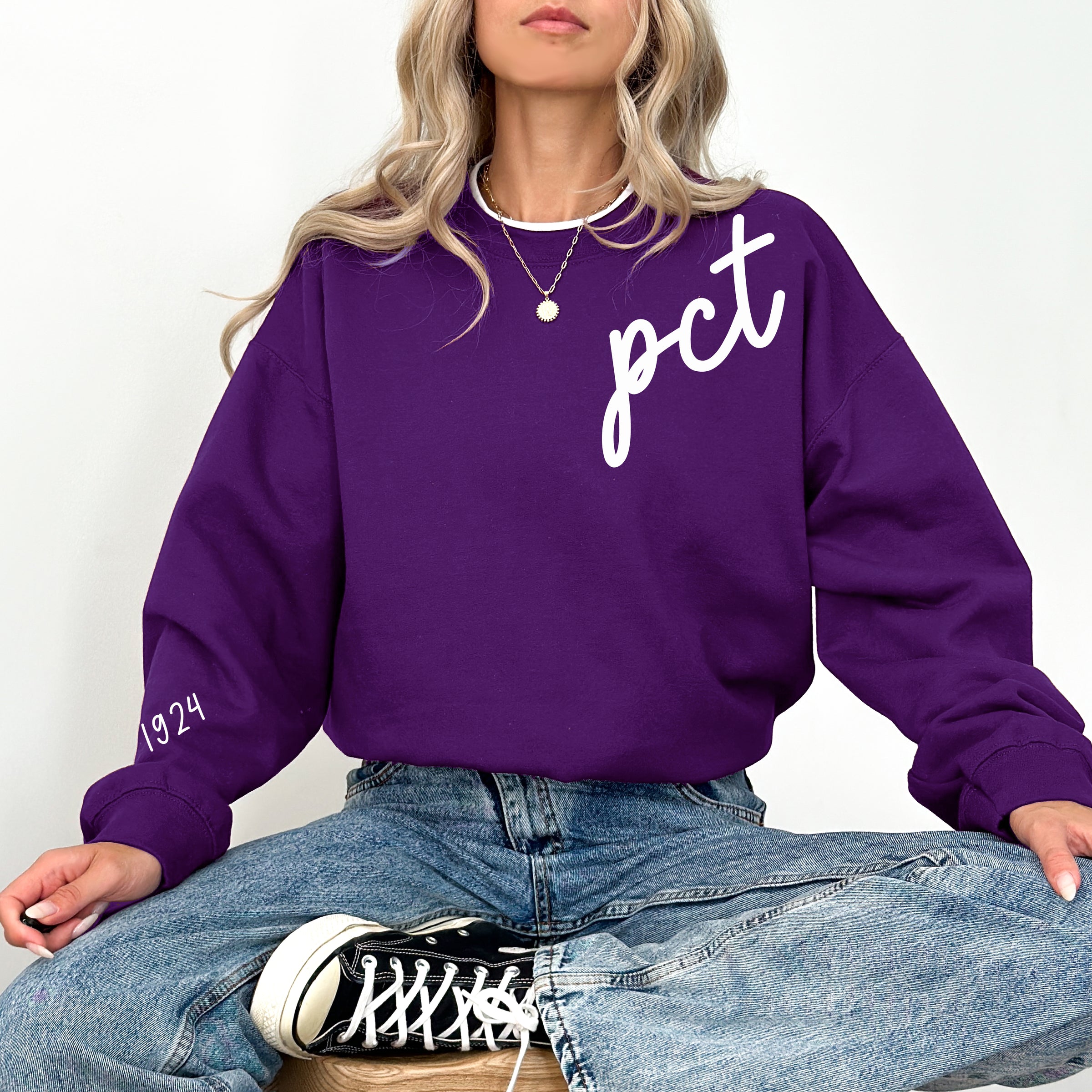 It's time to update your Phi Chi Theta crewneck collection! Available now...our pct 1924 crewneck available in purple with white