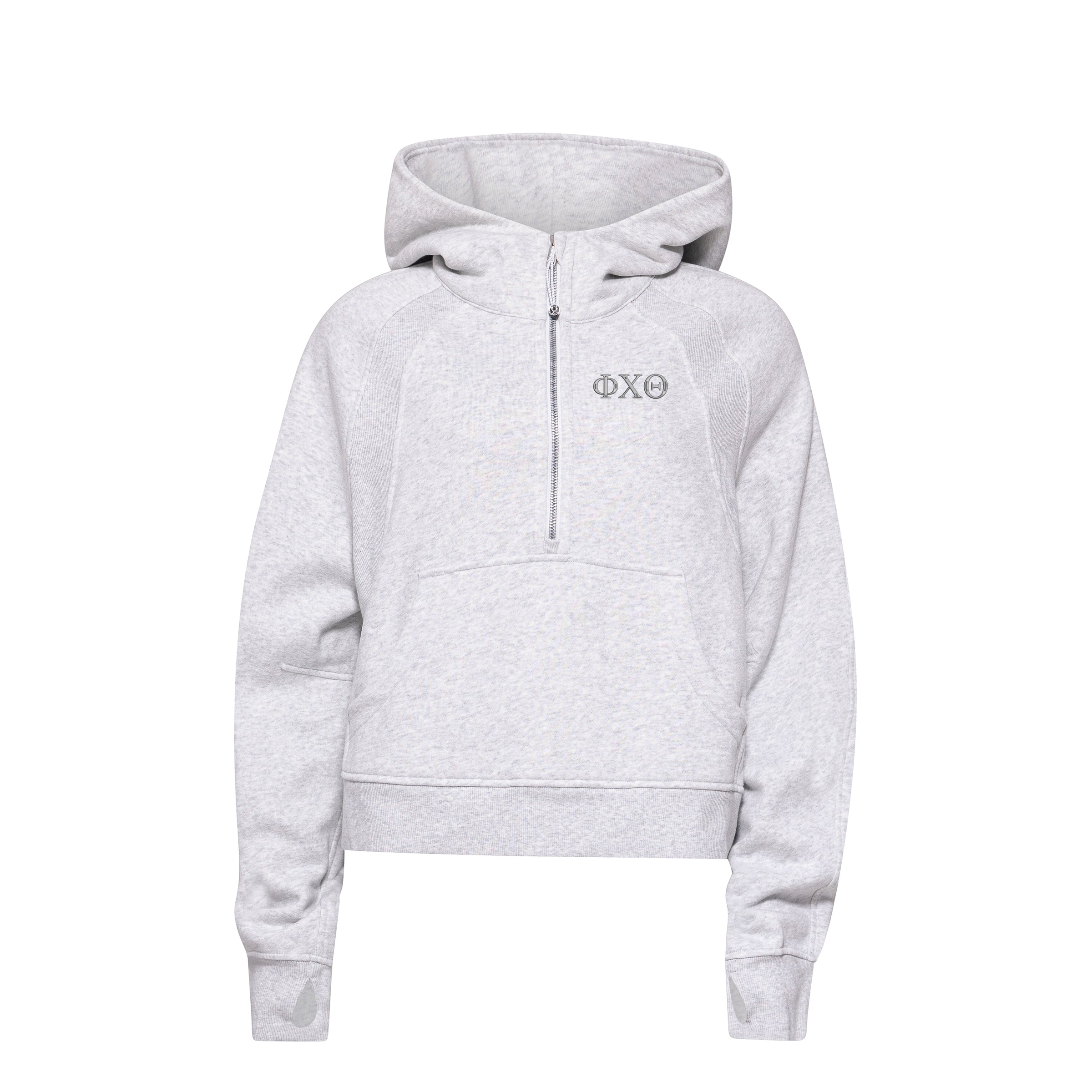 Made by lululemon, brought to you by Sorority Letters Shop, this is the must have Phi Chi Theta hoodie of the season. Serious about softness, this lululemon half-zip hooded sweatshirt is all about fleecy fabric. An exaggerated fit that feels extra roomy is not too short, not too long, just right around the waistband. Available in Heathered Core Ultra Light Grey with your Phi Chi Theta Greek letters embroidered in purple or tonal grey. lululemon yogo embroidered on the back of the hood.