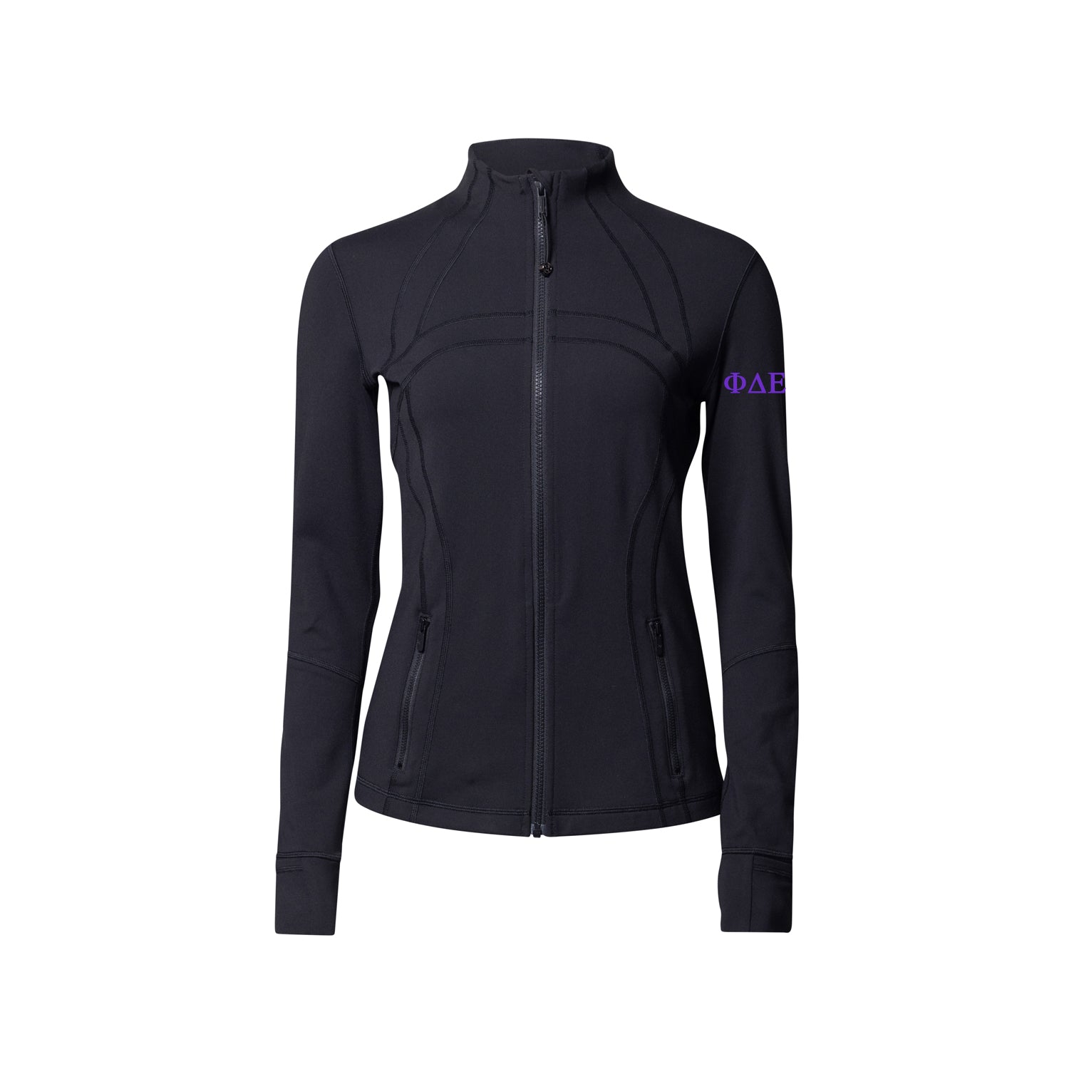 Made by lululemon, brought to you by Sorority Letters Shop. Whether you're up for adventure or ready for downtime, our fan-favourite Phi Delta Epsilon Define Jacket has a feel-good fit that can do it all. Made of Luon fabric and sits below the waistband for moderate, everyday coverage. Perfect for campus or your next Phi Delta Epsilon event. Available in black with the Phi Delta Epsilon Greek letters printed on the left sleeve in purple.