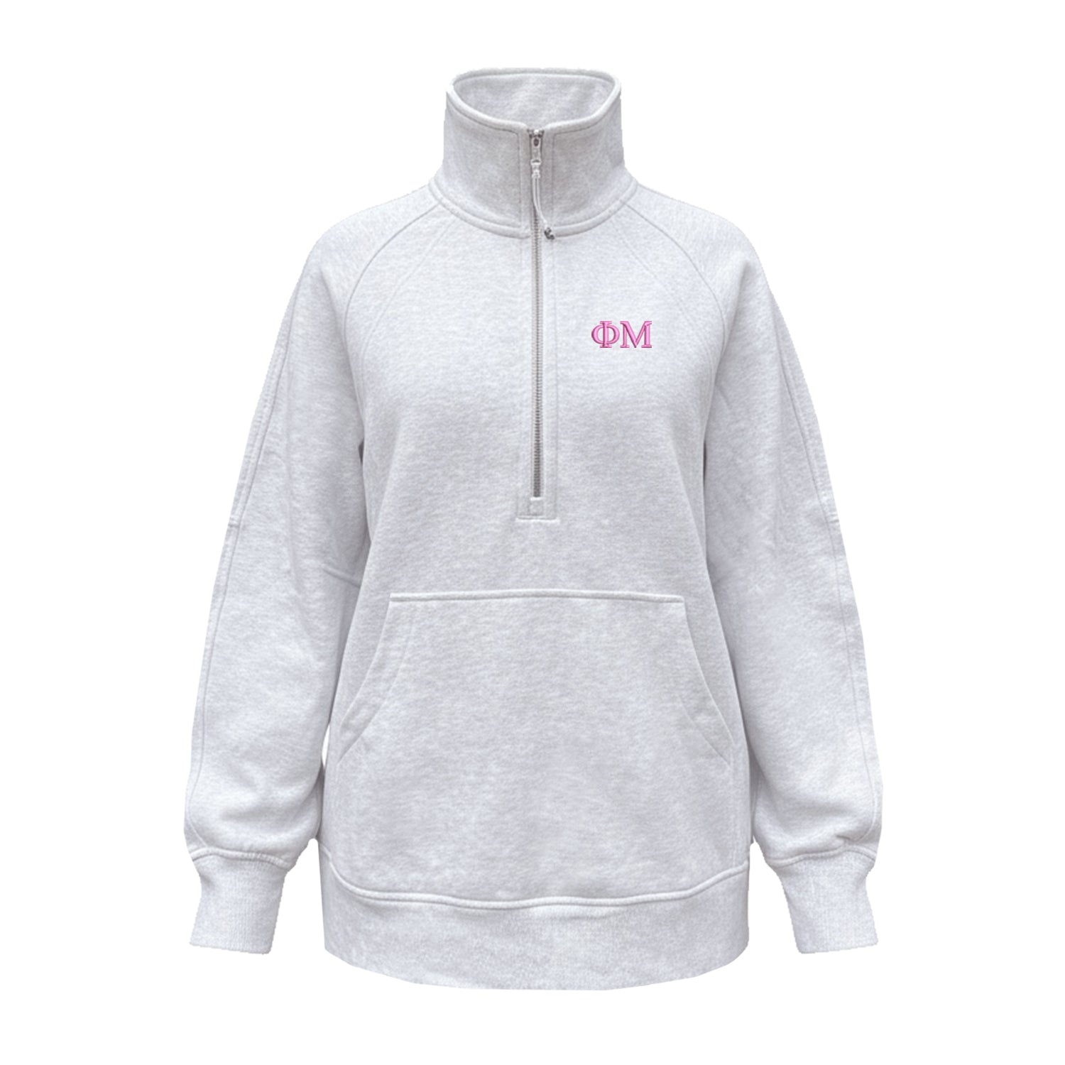 Serious about softness. This funnel-neck half zip is all about fleecy fabric and sinking in to a cozy oversized fit.  Available in Heathered Core Ultra Light Grey with your Phi Mu letters embroidered.