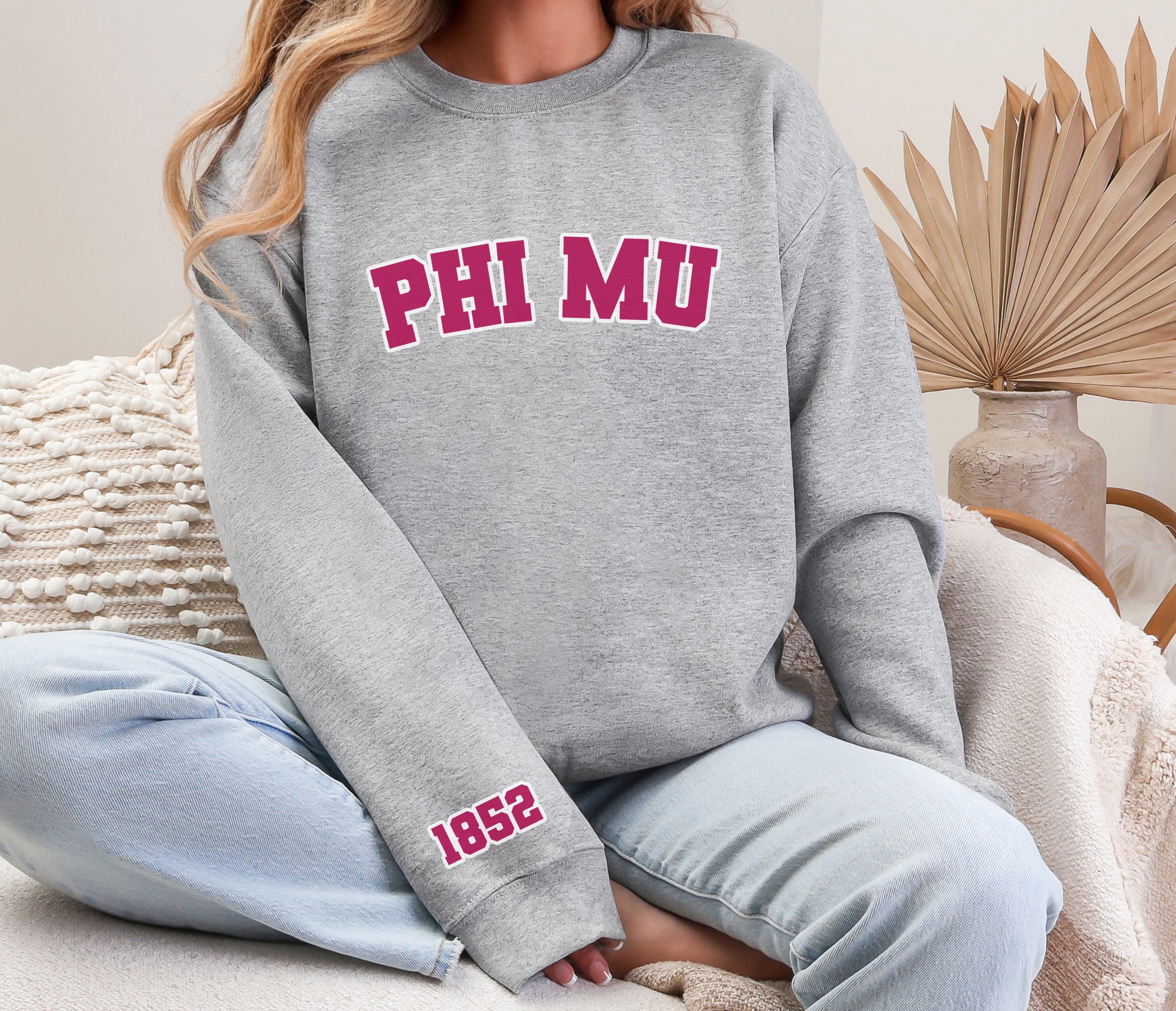 It's time to update your crewneck collection! Available now...our Phi Mu crewneck is available in athletic grey printed with a varsity outlined Phi Mu and established year on the cuff.