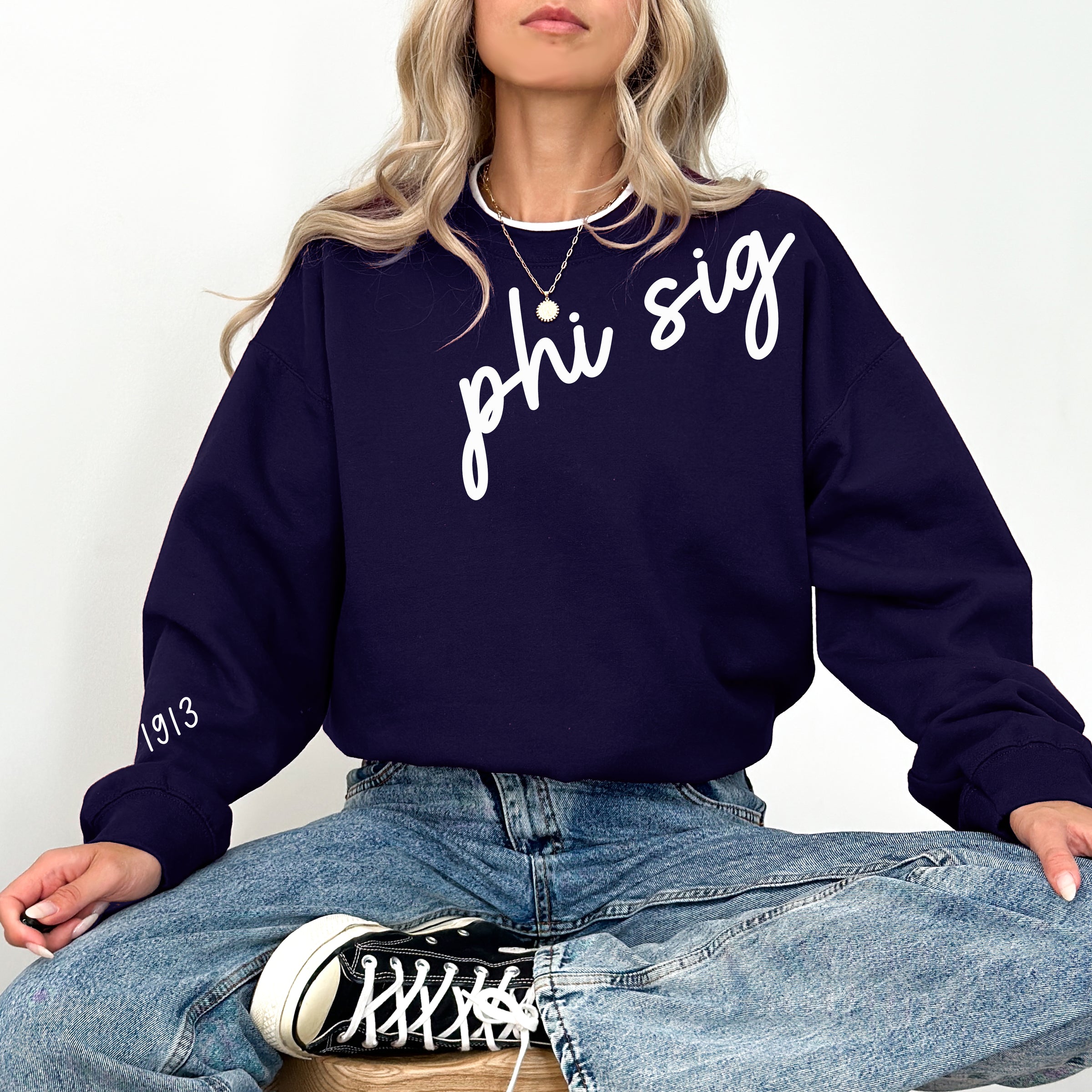 It's time to update your Phi Sigma Sigma crewneck collection! Available now...our Phi Sig 1913 crewneck available in navy with white