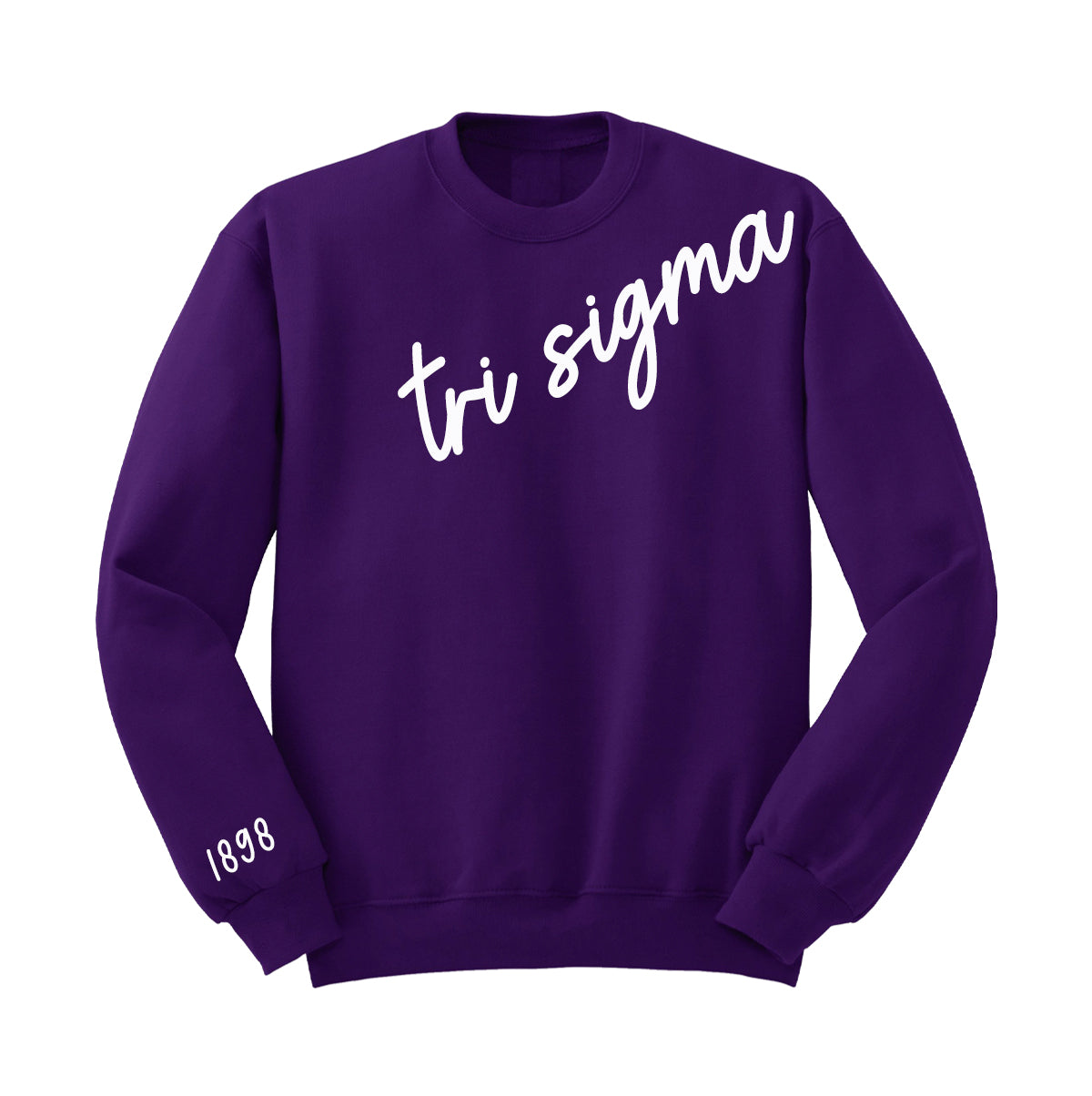 It's time to update your Sigma Sigma Sigma crewneck collection! Available now...our 1898 Sigma Sigma Sigma crewneck available in purple with "tri sigma" and 1898 printed in white.