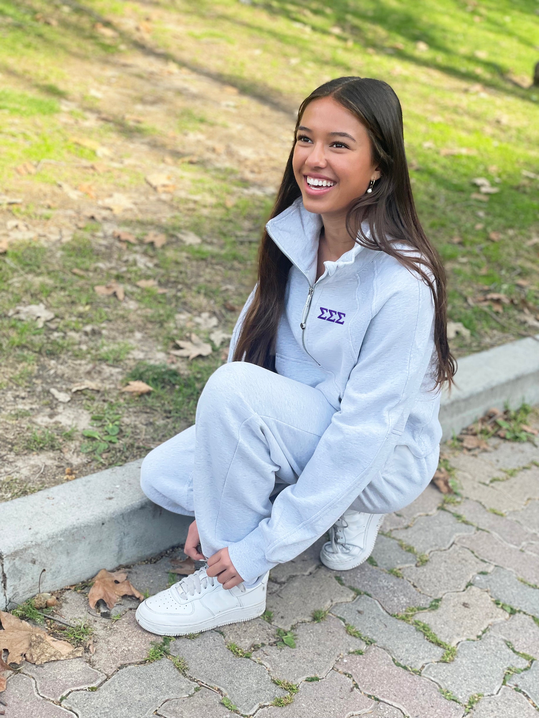 Made by lululemon, brought to you by Sorority Letters Shop, this is the must have Sigma Sigma Sigma sweatshirt of the season. Classic lululemon oversized, crop length, half-zip funnel neck comes embroidered with your choice of tonal grey or purple Sigma Sigma Sigma Greek letters. With an oversized fit, a cozy funnel neck, and the soft fabric you love, this Scuba silhouette maximizes post-practice comfort.